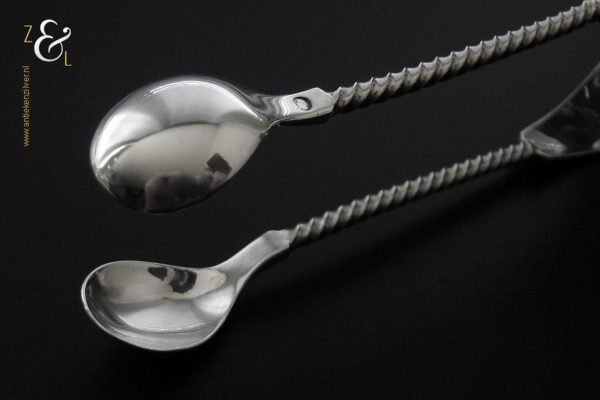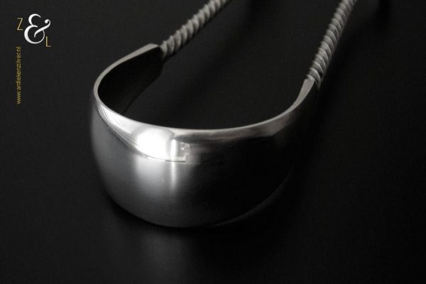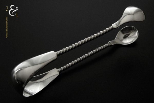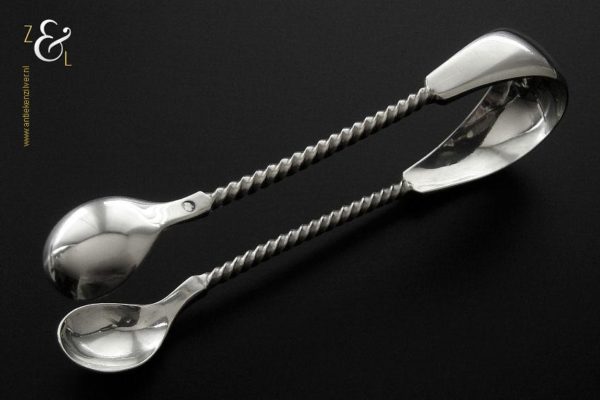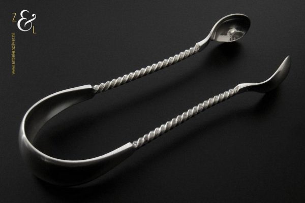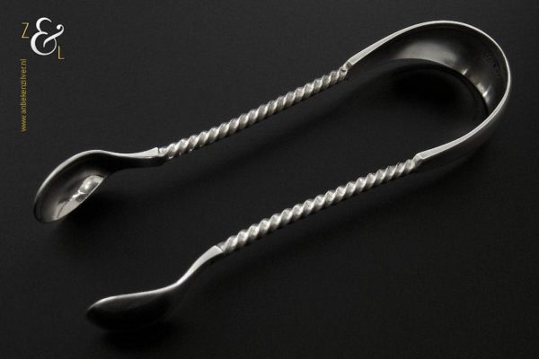 Deze suikerklontjestang / kandijtang is gemaakt in Amsterdam door Jilles Limburg (meesterteken JL onder 5 in vierkant) in het jaar 1880 (jaarletter V). De zilveren Neostijl suikerklontjestang / kandijtang heeft getordeerde stelen weegt 42 gram en is 13.4 cm lang.