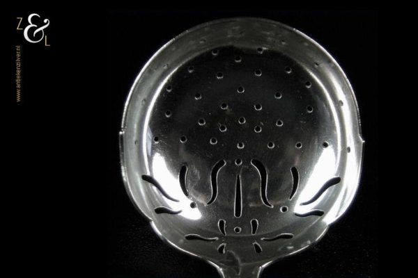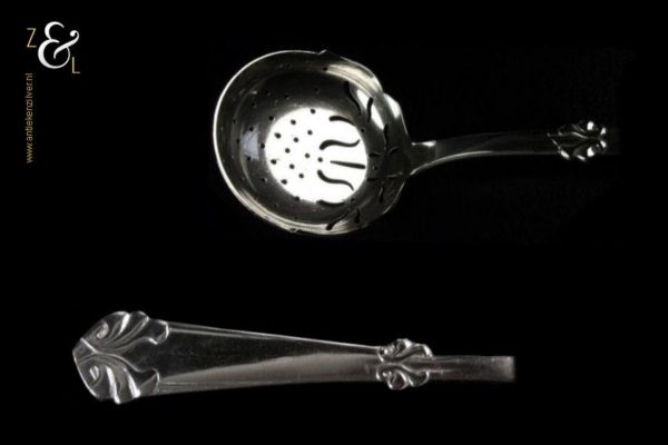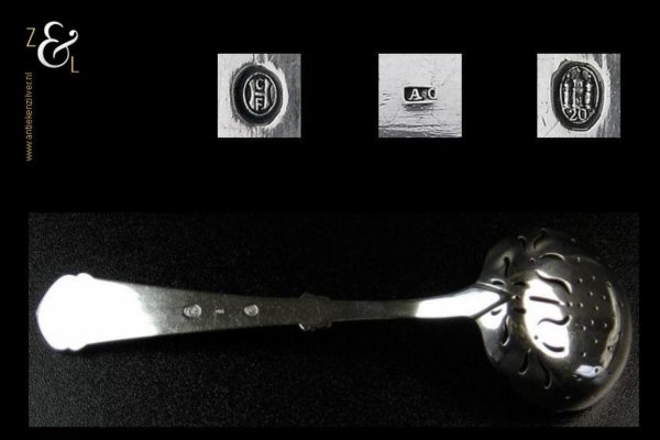 Suikerstrooilepel gemaakt in Maribo Denemarken door A.O. Olsen (meesterteken AO in rechthoek). De suikerstrooilepel is tevens gestempeld met het essayeursmerk CFH in ovaal dat staat voor essayeur C.F. Heise werkzaam van 1904 tot 1932 en het zilverkeur drie torens met daaronder het getal 20 duidend op het jaartal 1920 dit is het jaar waarin het stuk gemaakt is. De zilveren Art Deco suikerstrooilepel heeft een stilistisch gevormde gegoten steel en handvat waarvan de vormen weer terugkomen in het zaagwerk van de lepelbak. De strooilepel weegt 39 gram is 16.2 cm lang. De lepelbak heeft een diameter van 4.9 cm.