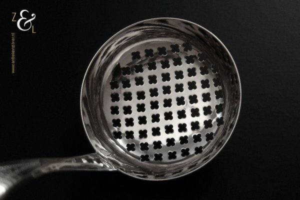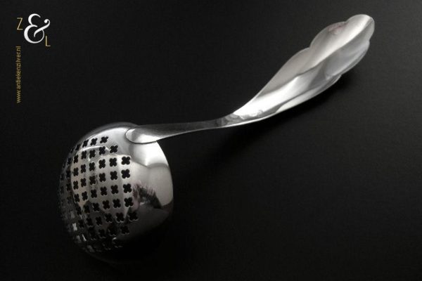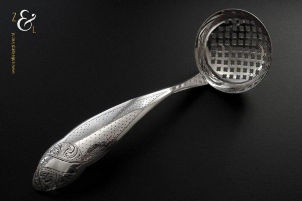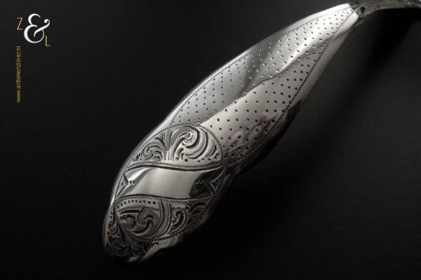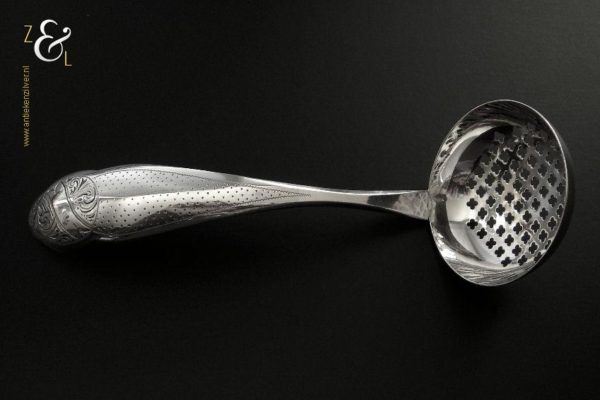 Suikerstrooilepel gemaakt in Schoonhoven door Gerrit van der Dussen (meesterteken GD boven 109 in vierkant) in het jaar 1882 (jaarletter X). De zilveren suikerstrooilepel waarvan de steel is gegraveerd met c-vormige voluten en een stippelmotief heeft aan het uiteinde een cartouche (met ruimte voor een monogram of initialen). De strooilepel weegt 27 gram en is 15.5 cm lang. De lepelbak heeft een diameter van 4.9 cm.