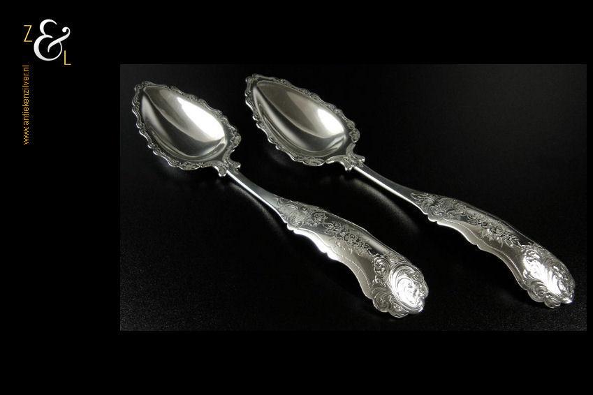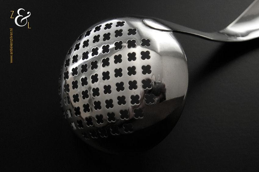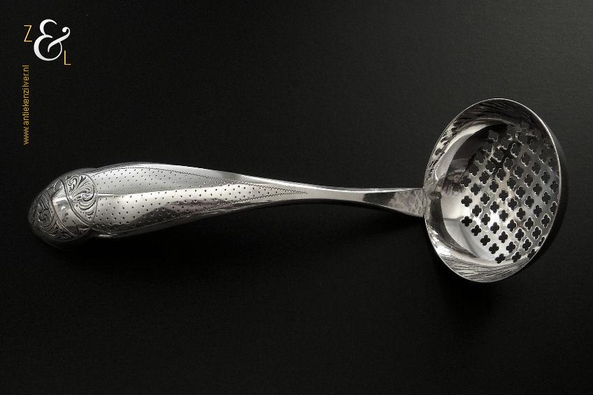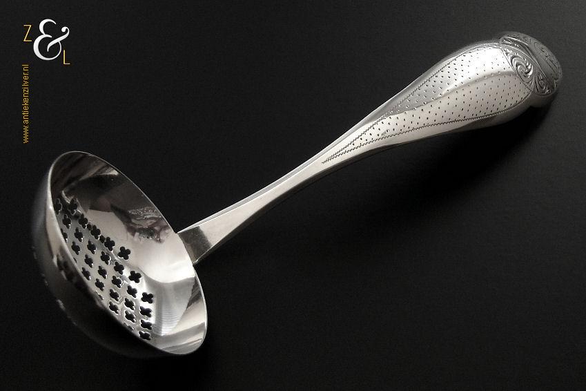 Suikerstrooilepel gemaakt in Schoonhoven door Gerrit van der Dussen (meesterteken GD boven 109 in vierkant) in het jaar 1882 (jaarletter X). De zilveren suikerstrooilepel waarvan de steel is gegraveerd met c-vormige voluten en een stippelmotief heeft aan het uiteinde een cartouche (met ruimte voor een monogram of initialen). De strooilepel weegt 27 gram en is 15.5 cm lang. De lepelbak heeft een diameter van 4.9 cm.
