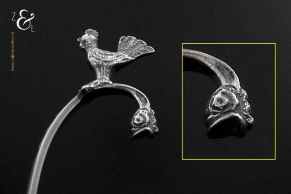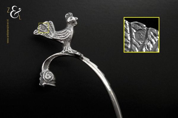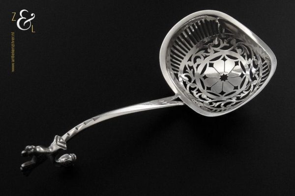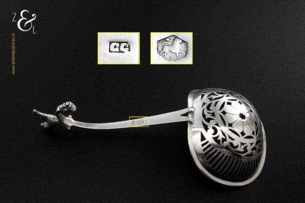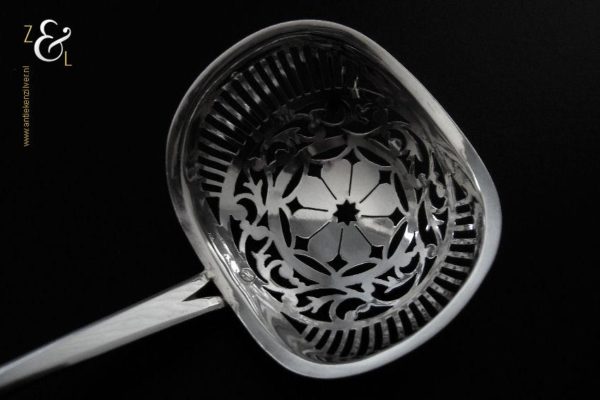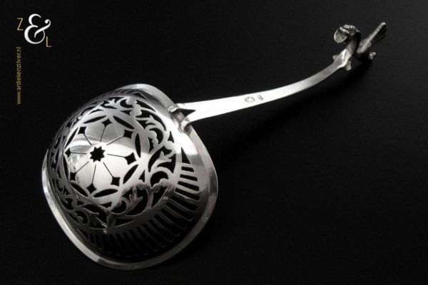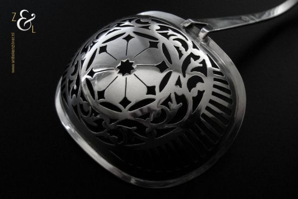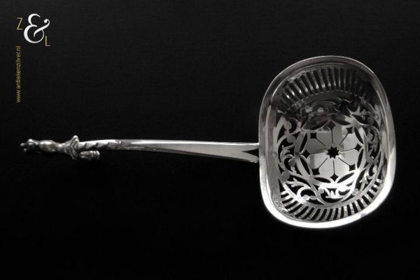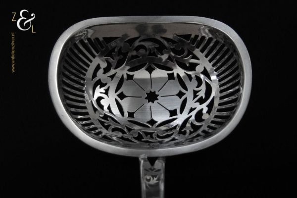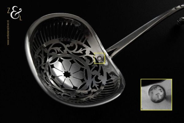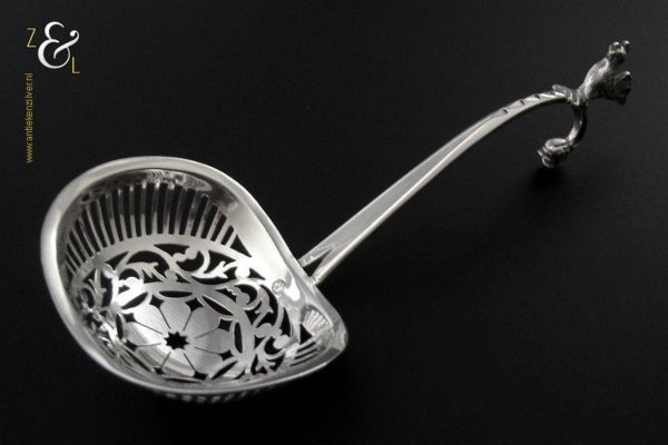 Suikerstrooilepel gemaakt in Schoonhoven door Gerrit Regtdoorzee Greup (meesterteken GG in rechthoek) in het jaar 1907 (jaarletter X). De zilveren Neostijl suikerstrooilepel heeft een ovale lepelbak die op de hand is uitgezaagd met spijlen en een gestileerd bloemmotief. Het uiteinde van de steel is bekroond met een haan en eindigt in een krul (met dolfijnenkop) zodat je de lepel aan een kom kan hangen (krul en haan zijn gegoten). De strooilepel weegt 29 gram en is 13.8 cm lang. De lepelbak is 6.4 cm lang bij 5.1 cm breed.