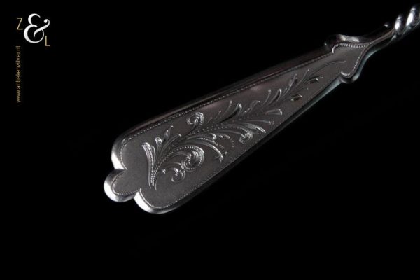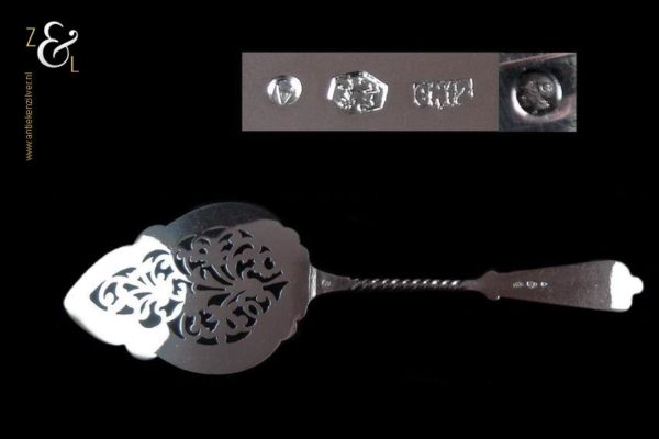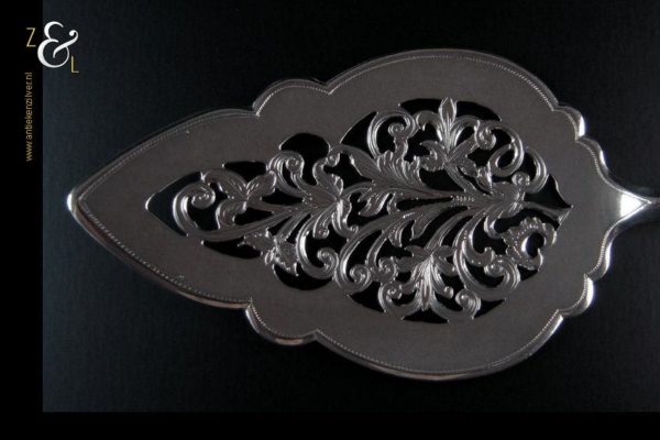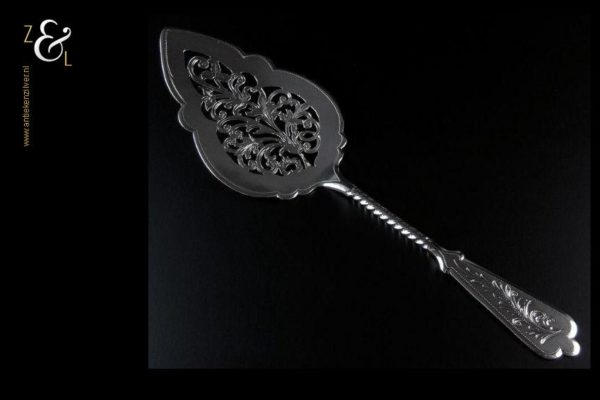 Taartschep gemaakt in de Art Deco periode in Schoonhoven door Cornelis Hooijkaas (meesterteken CH 12 in rechthoek) in het jaar 1910 (jaarletter A). Deze royale uitgezaagde deels gematteerde (matteren is een bewerking waarbij de zilversmid het oppervlak van een zilveren voorwerp een matte structuur geeft) en gegraveerde zilveren taartschep met getordeerde steel weegt 77 gram en is 26 cm lang de schep meet 12 cm bij 7.6 cm.