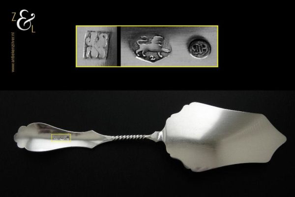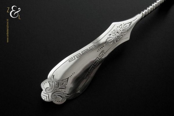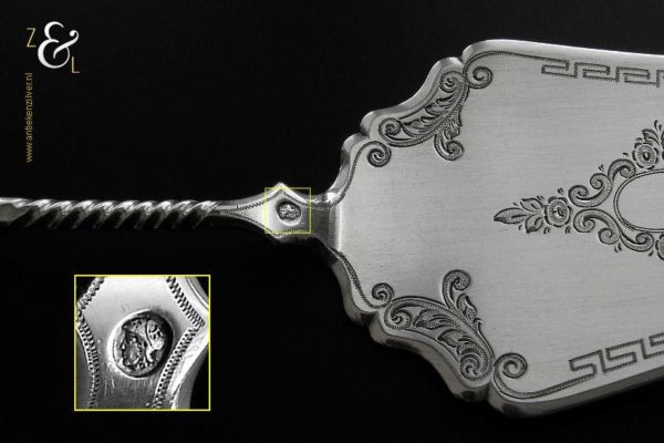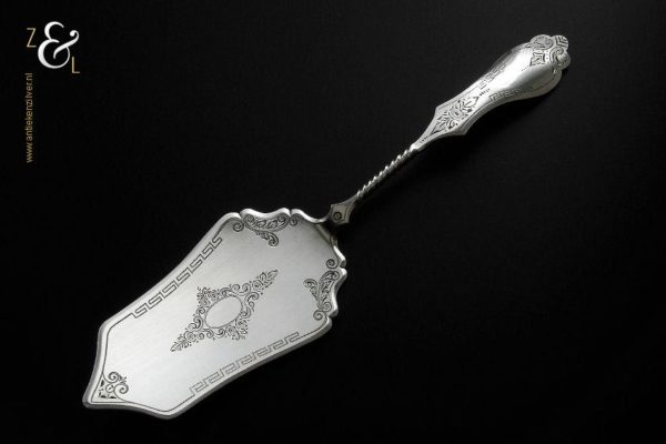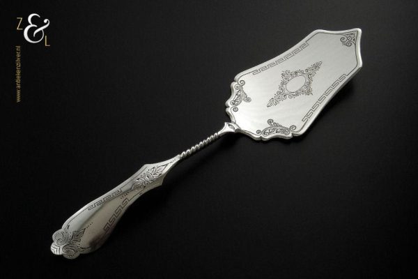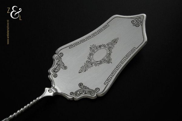 Taartschep gemaakt in Woudsend / Sneek Friesland door Johannes Schijfsma (meesterteken JS boven 189 in vierkant) in het jaar 1896 (jaarletter M). De zilveren taartschep heeft een getordeerde steel en zowel de schep als handvat is sierlijk gegraveerd met c-vormige voluten bloem- en meandermotieven. De taartschep weegt 55 gram en is 21.8 cm lang. Het schepgedeelte is 9.7 cm lang bij 5.4 cm breed. De taartschep heeft gebruikssporen.