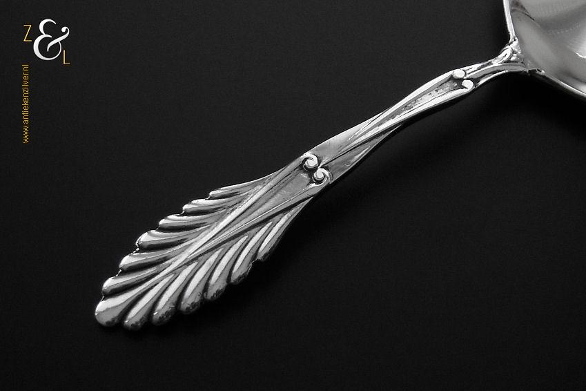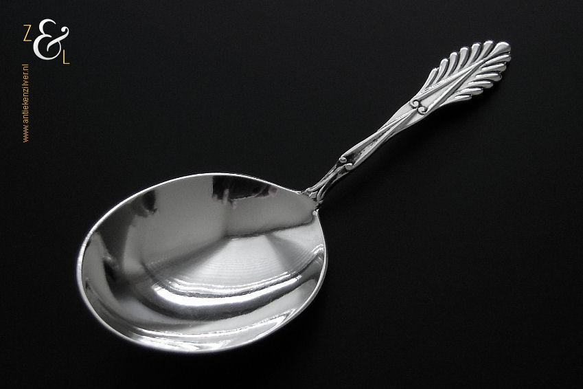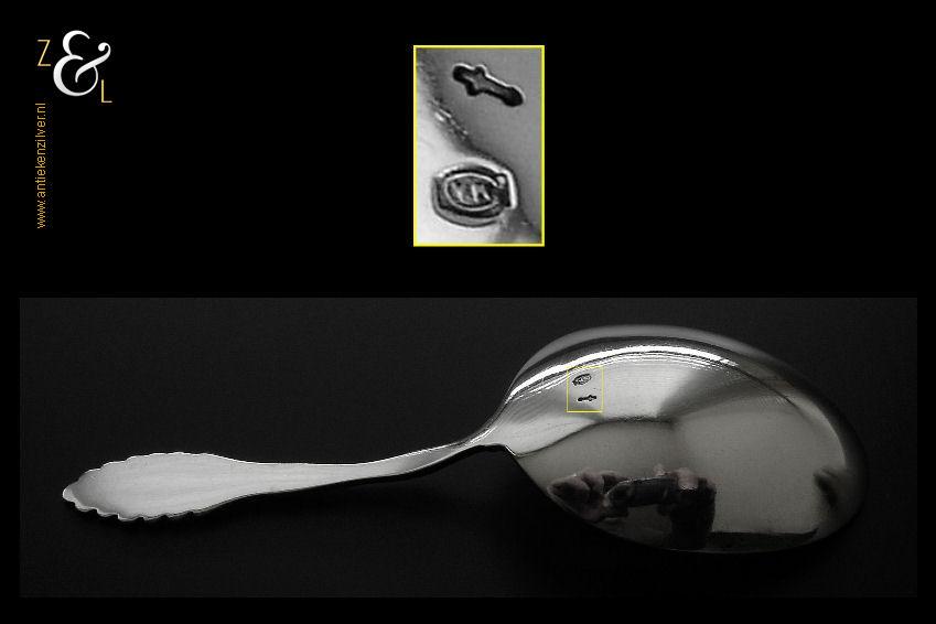Theeschep / theeduim gemaakt in Zeist door Gerritsen & van Kempen N.V. (meesterteken V.K. in G) tussen de jaren 1926 en 1953 (gekeurd met het zilverkeur zwaardje). De zilveren Art Deco stijl theeschep / theeduim model waaier / palmet weegt 17 gram en is 10.2 cm lang.