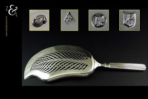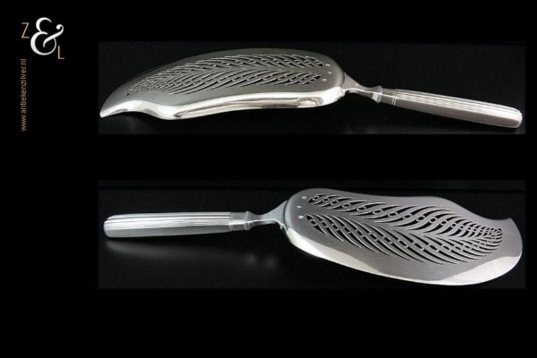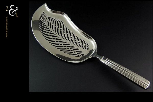 Visdienschep / visschep gemaakt in Amsterdam door Diederik Lodewijk Bennewitz (meesterteken D boven LB eronder een ster in pastille) in het jaar 1824 (jaarletter P). Deze grote zware eerste gehalte zilveren Empire visdienschep / visschep, weegt 202 gram en is 32.6 cm lang, de schep meet 19 cm bij 10 cm.