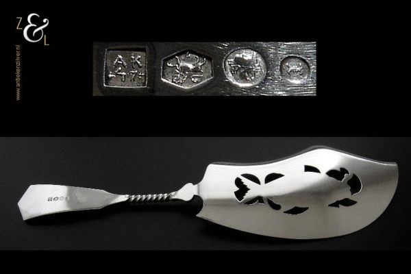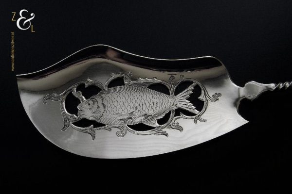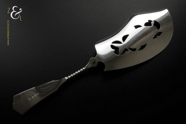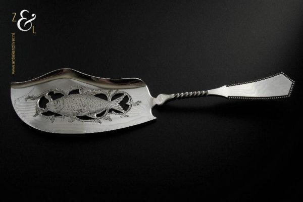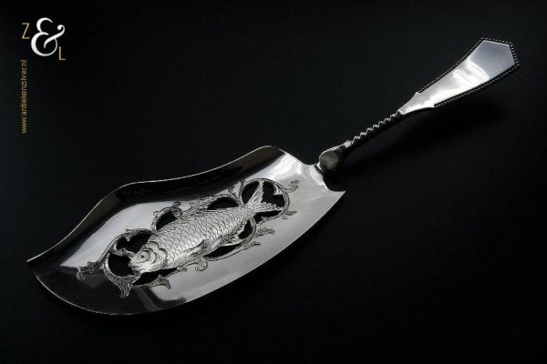 Visdienschep / visschep gemaakt in Schoonhoven door Jan Boon (meesterteken AK boven +47+ in vierkant) in het jaar 1907 (jaarletter X). De visdienschep / visschep heeft een getordeerde steel waarvan het handvat met parelrand is uitgevoerd en heeft een schepgedeelte met een uitgezaagde en gegraveerde vis. De zilveren Art Deco visdienschep / visschep weegt 144 gram is 28.5 cm lang. Het schepgedeelte meet 7.6 cm bij 14.5 cm.
