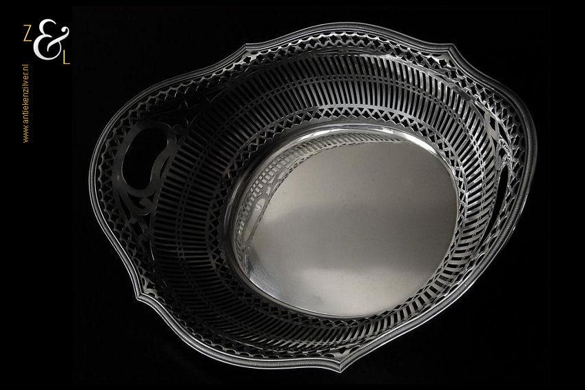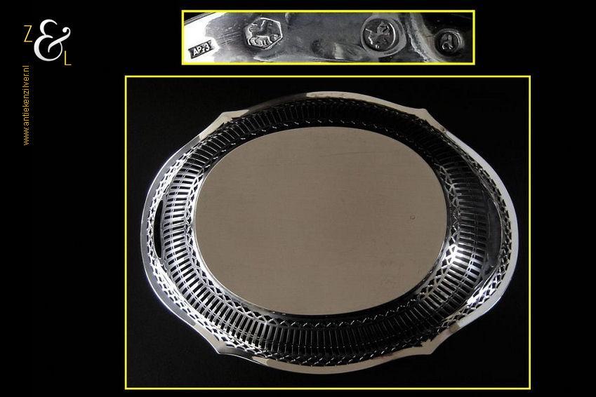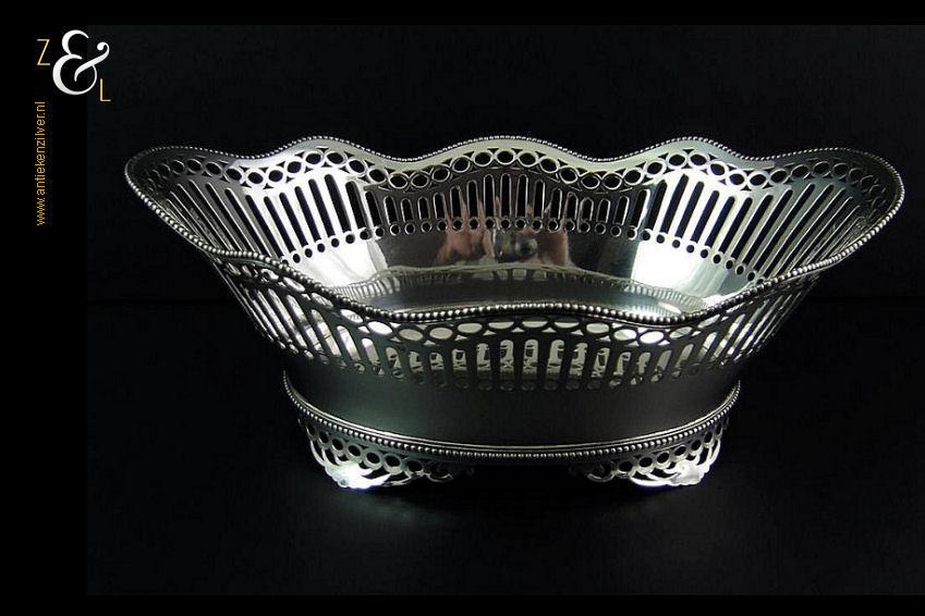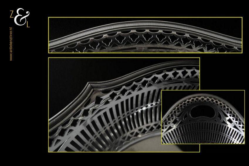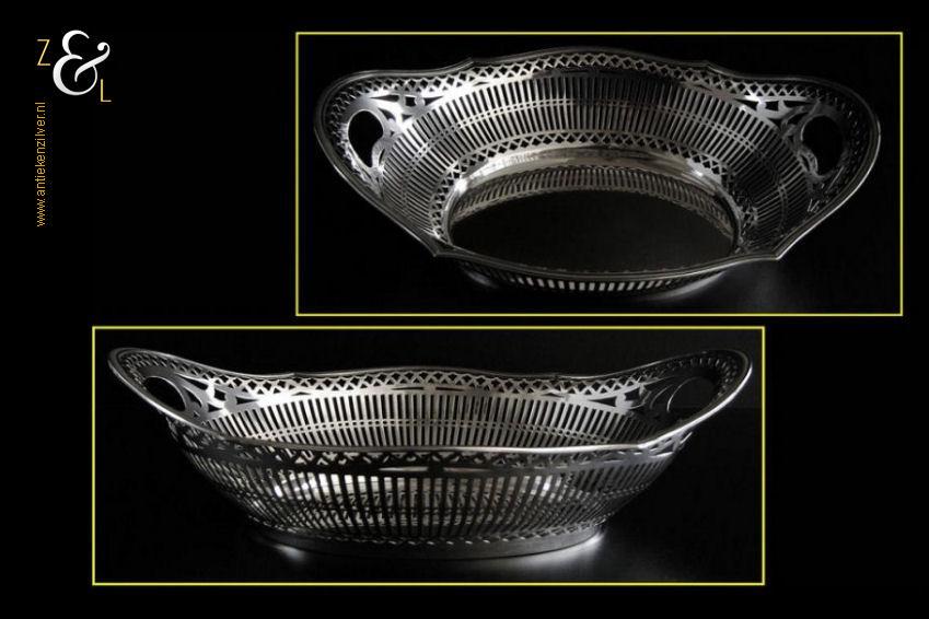 Broodmand gemaakt in Haarlem door de Firma A. Presburg & Zoon (meesterteken APz3 in zeskantige rechthoek) in het jaar 1963 (jaarletter D). De royale zilveren broodmand die is uitgevoerd met een exclusieve filetrand weegt 500 gram is 33.5 cm lang 24.2 cm breed en 9 cm hoog. De bodem van de broodmand is 19 cm lang bij 14.5 cm breed.