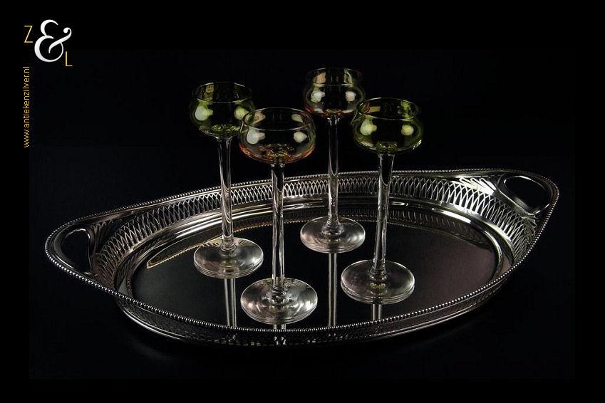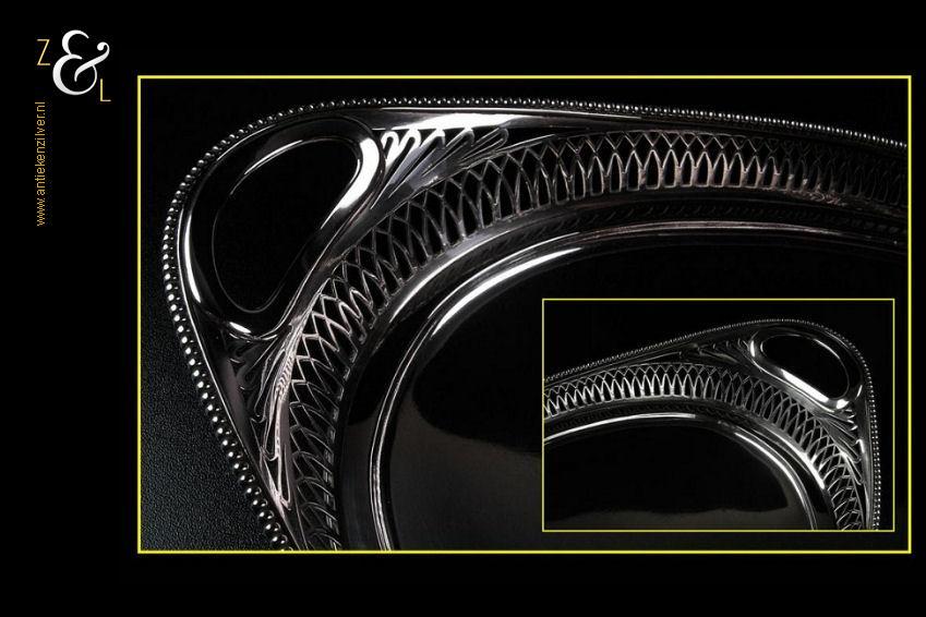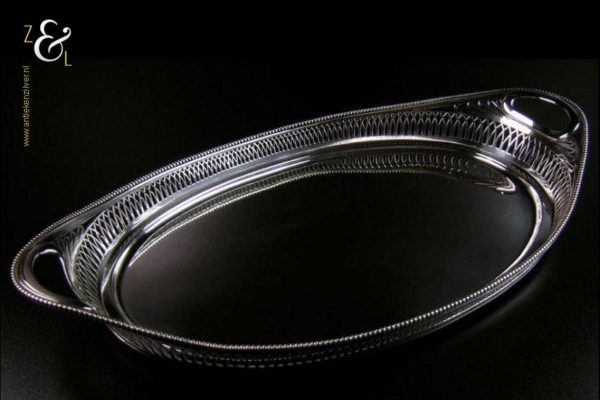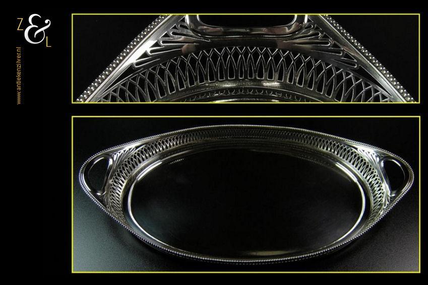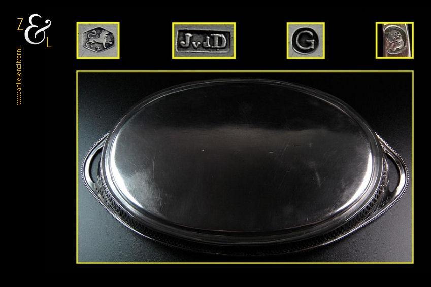 Dienblad gemaakt in Schoonhoven door J. van der Dussen (meesterteken JvdD in rechthoek) en Jacobus P. van den Berg (meesterteken V.D.B. ster in rechthoek) in het jaar 1916 (jaarletter G). Dit dienblad is gemaakt in een samenwerking tussen de zilversmeden Jan van der Dussen en Jacobus van den Berg. Het spits ovaal schuitvormig zilveren in Art Deco stijl vervaardigde dienblad heeft twee ovale grepen, een uitgezaagde galerierand en aan de bovenzijde een gesoldeerde parelrand. Het dienblad weegt 632 gram en is 37.5 cm lang 21.1 cm breed en 5 cm hoog.