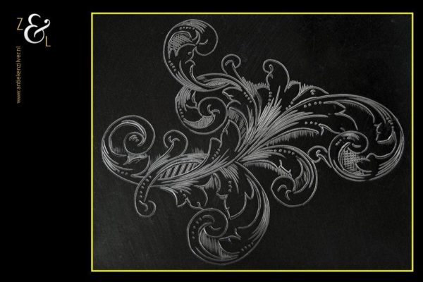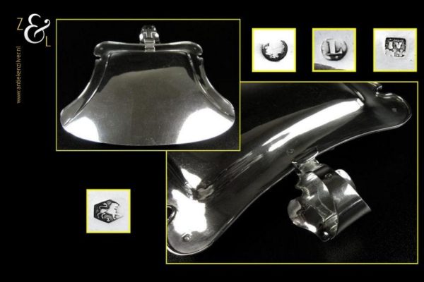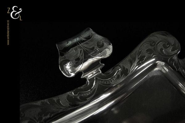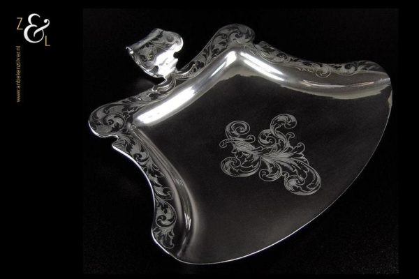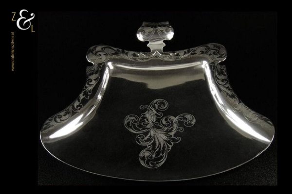 Kruimelblik gemaakt in Amsterdam door Jacob van Wijk senior (meesterteken IV boven W+ in vierkant) in het jaar 1845 (jaarletter L). Dit fijn gegraveerde zilveren Biedermeier kruimelblik weegt 129 gram en is 16.7 cm lang en 19 cm breed.