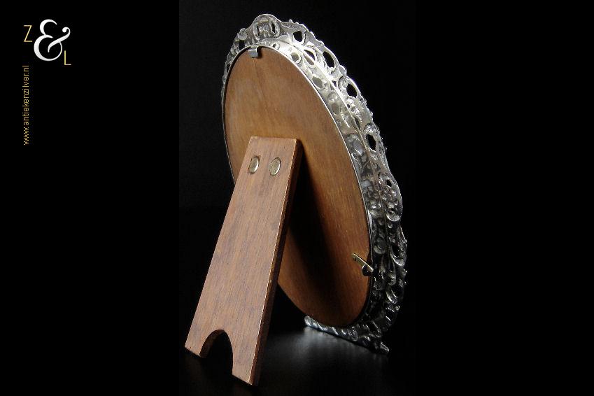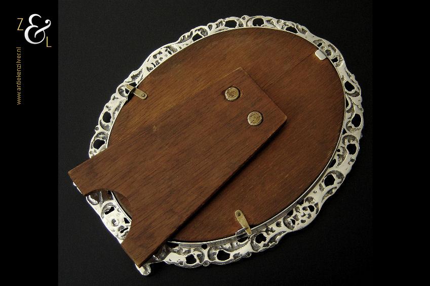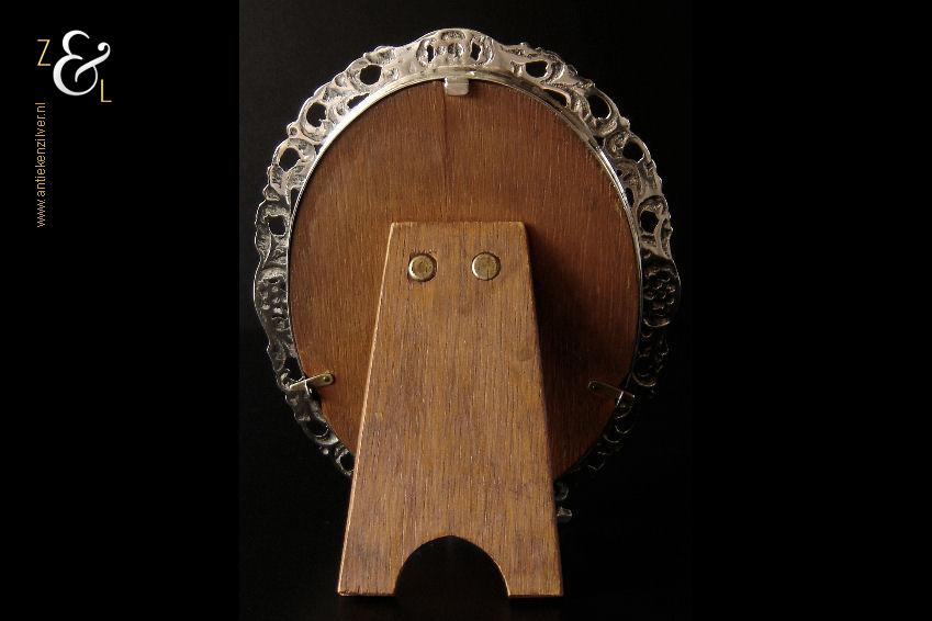 Deze fotolijst is gemaakt in Haarlem door G. la Court (meesterteken 4LC in zeshoek) in het jaar 1968 (jaarletter I). De fotolijst heeft zijn originele houten achterkant die makkelijk uitneembaar is door twee verschuifbare haakjes. De ajour gegoten zilveren fotolijst weegt inclusief glas en achterkant bruto 115 gram, de zilveren lijst weegt netto 50 gram en is 13.8 cm lang bij 11.1 cm breed. De fotolijst is geschikt voor ovale foto’s van 11.2 cm bij 8.4 cm en heeft nog het originele bolle glas. Op de afbeeldingen is de fotolijst (i.v.m. reflectie in het bolle glas) gefotografeert mèt en zònder glas.