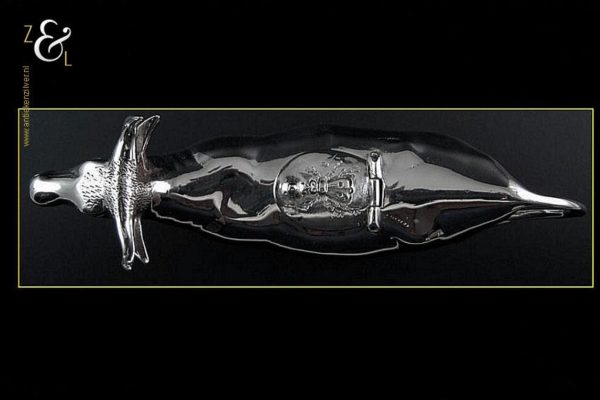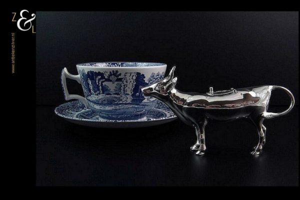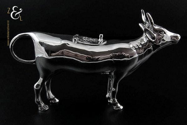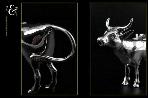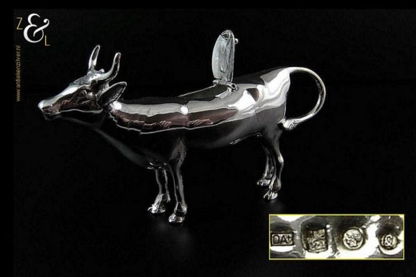 Melkkoe / melkkan / roomkan geïmporteerd door de Firma D.J. Aubert en Zonen te Voorburg – Den Haag (importeurskeurmerk DA+ in rechthoek) in het jaar 2000 (jaarletter Q). Dit eerste gehalte zilveren melkkoetje wordt van boven via de opening onder het dekseltje gevuld met melk of room, de staart dient als handvat en men schenkt hem uit via de snuit. De melkkoe / melkkan / roomkan weegt 155 gram, is 13.8 cm lang en 7.8 cm hoog.