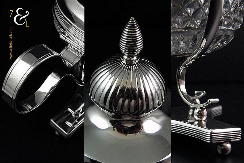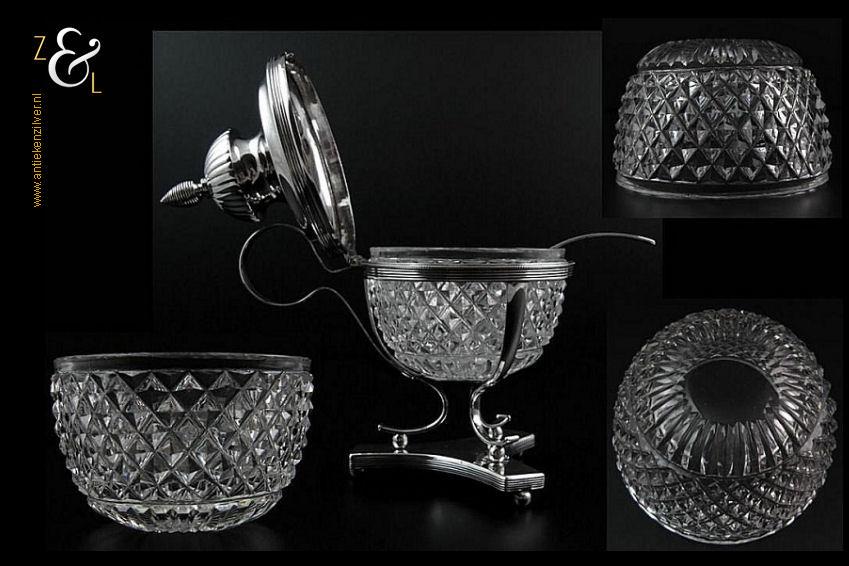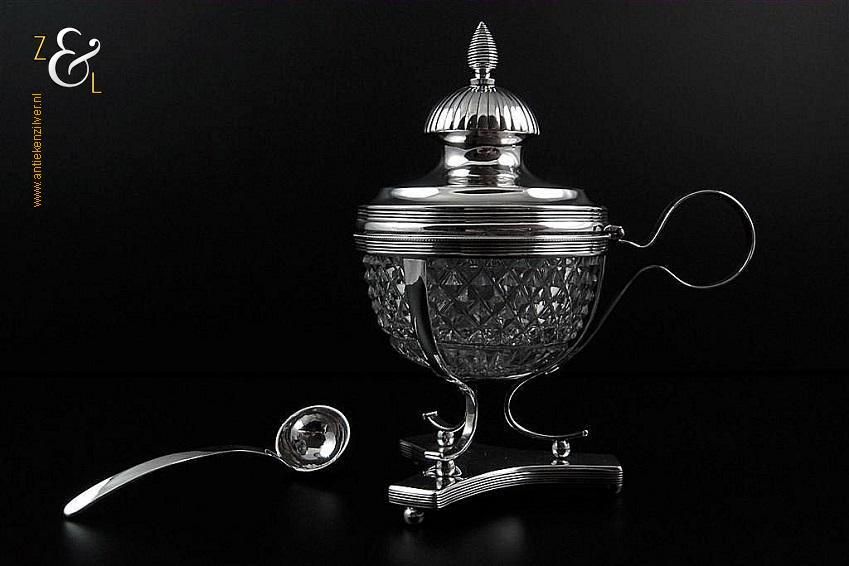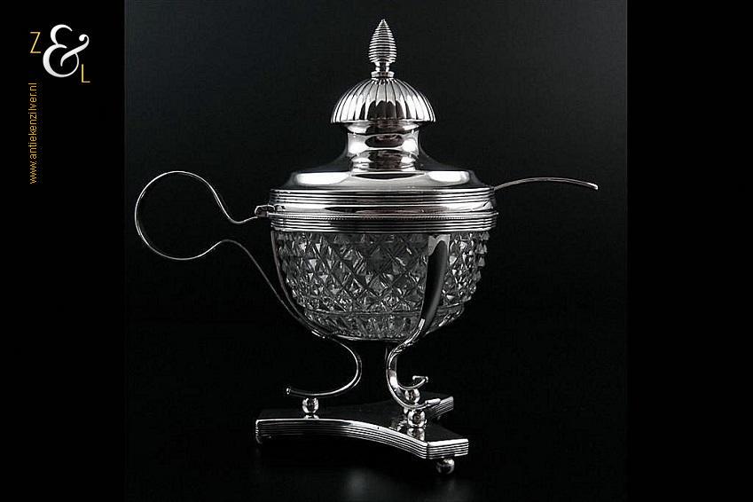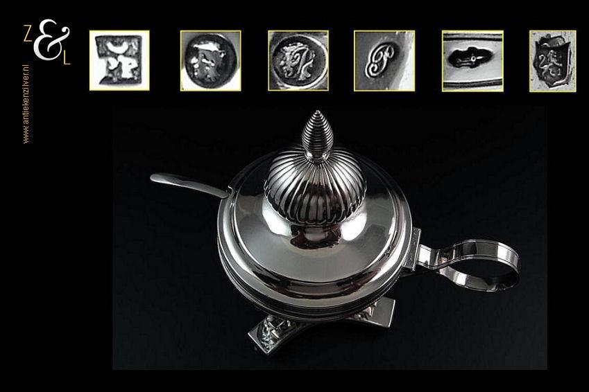 Mosterdpot plus bijbehorende mosterdlepel en originele geslepen kristallen binnenbak gemaakt in Amsterdam door Pieter Gerard Petersen (meesterteken liggend maantje boven PP in vierkant) in het jaar 1824 (jaarletterP). Deze eerste gehalte zilveren Empire mosterdpot en lepel wegen samen zonder de kristallen binnenbak 175 gram. De mosterdpot is 14.3 cm hoog en de bak heeft een diameter van 7.4 cm. Opmerkelijk is dat er bij het stempelen van de keurkamer in Amsterdam het een en ander is misgegaan, zie bij afbeelding 5 bovenaan bij de keuren de derde inzet van links: door het kantoorstempel heeft men tevens het jaarletter geslagen en bij de zesde inzet van links heeft men over het 2e gehalte het eerste gehalte keur geslagen. Verder zijn alle keuren er ook op de goede manier ingeslagen.