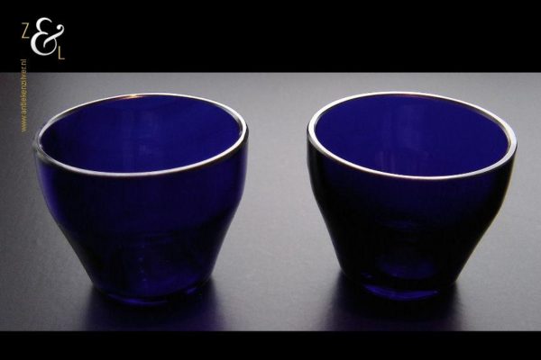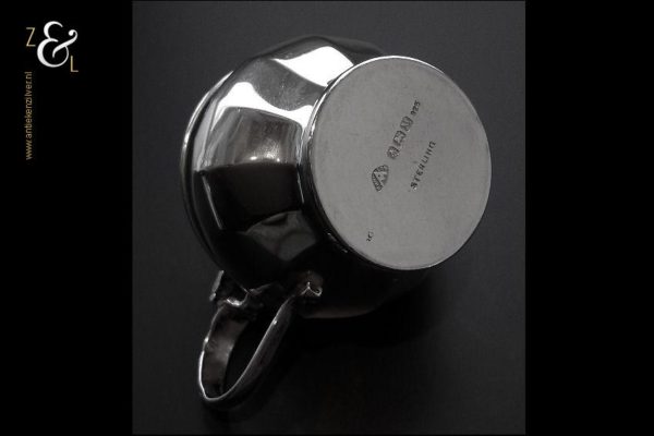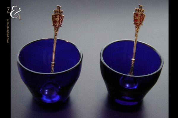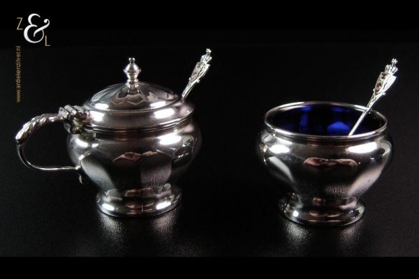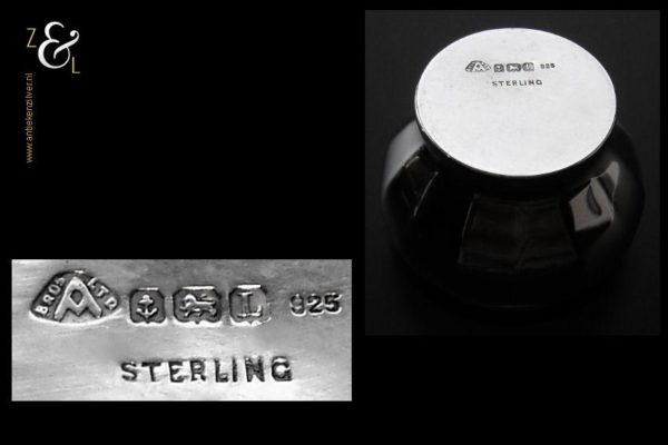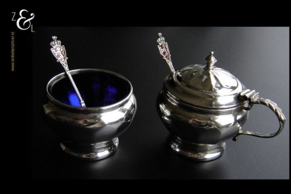Dit zoutvat en deze mosterdpot zijn gemaakt in Birmingham Engeland bij de firma Adie Brothers Limited (meesterteken Bros A Ltd in afgeronde driehoek). Tevens zijn ze gekeurd met het anker voor Birmingham, de lopende leeuw voor 925 sterling zilver, jaarletter L in schild voor het jaar 1935, het gehaltecijfer 925 en sterling. De mosterdpot en zoutvat hebben beide de originele blauw glazen binnenbakken. Het blauwe glas wordt in Engeland ook wel Bristol blue glass genoemd omdat men daar dit blauwe glas sinds de 18e eeuw produceerde. Het zoutvat heeft een hoogte van 3.5 cm en een diameter van 5 cm. De mosterdpot is 5.5 cm hoog, heeft een diameter van 5 cm en is met het oor meegerekend 7cm breed.