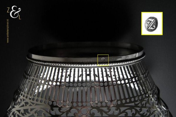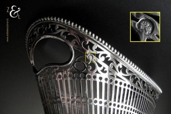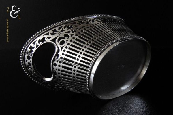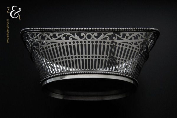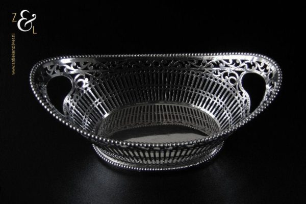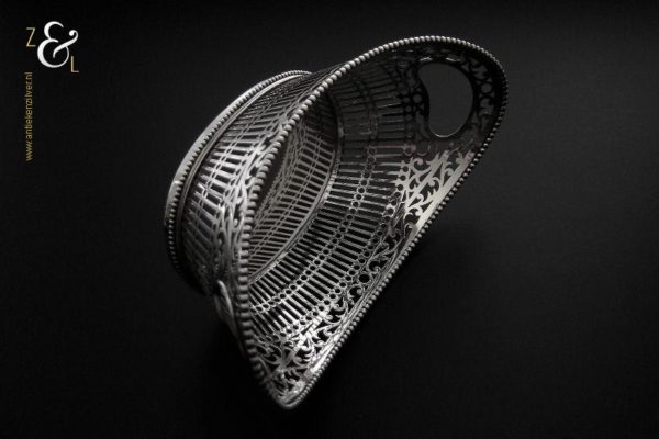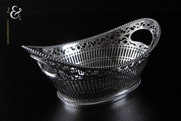 Bonbonmandje gemaakt in Schoonhoven door Gerrit Regtdoorzee Greup (meesterteken GG in rechthoek) in het jaar 1909 (jaarletter Z). Het op de hand uitgezaagde schuitvormige zilveren bonbonmandje heeft langs de boven- en onderkant een parelrand. Het mandje weegt 125 gram is 15.4 cm lang 8.5 cm breed en 6.5 cm hoog.
