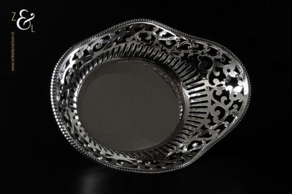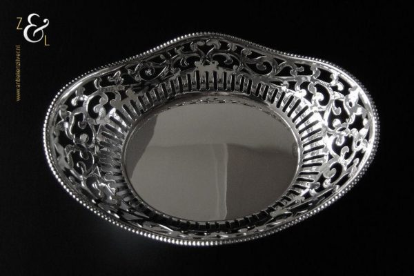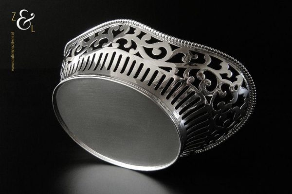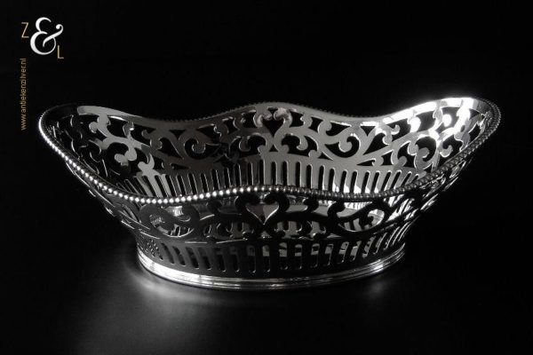Bonbonmandje gemaakt in Zeist / Voorschoten door de zilversmederij Koninklijke Van Kempen & Begeer B.V. (meesterteken kroon boven VKB boven liggend maantje in vierkant) dit meesterteken is in gebruik vanaf 1961 tot heden. Tevens is dit mandje gestempeld met 835 dat staat voor 2e gehalte zilver en gekeurd met het zilverkeur ZII (zilver 835 duizendsten) dit stempel werd gebruikt voor gehaltemerken sinds 1-9-1953 voor voorwerpen in voltooide staat aangeboden. Het op de hand uitgezaagde bonbonmandje heeft langs de bovenkant een parelrand en aan de onderkant een filetrand. Het mandje dat in de tweede helft van de 20e eeuw gemaakt is weegt 118 gram is 15.8 cm lang 11 cm breed en 5 cm hoog.