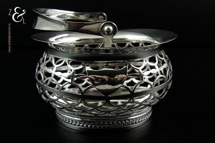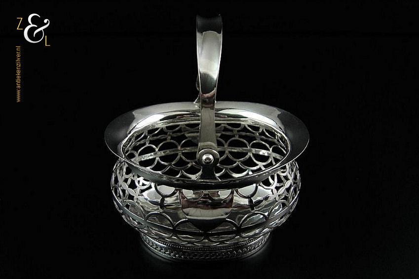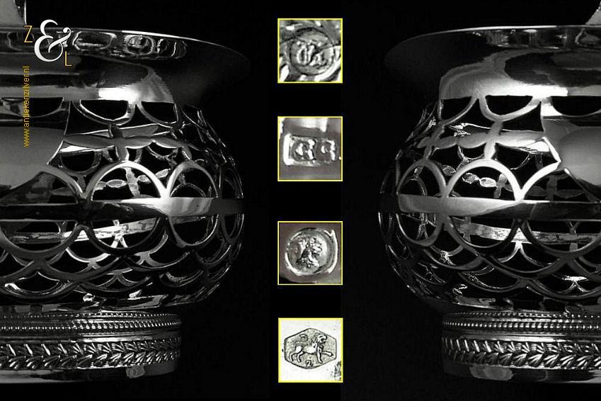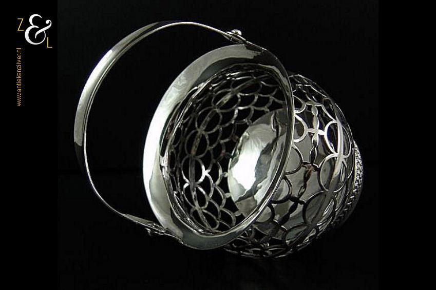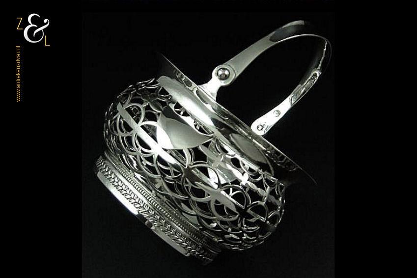 Kluwenmandje gemaakt in Schoonhoven door Gerrit Greup Regtdoorzee (meesterteken GG in rechthoek) in het jaar 1906 (jaarletter W). Dit zilveren Art Deco kluwenmandje is op de hand gedreven en uitgezaagd. Het kluwenmandje weegt 72 gram is 8.2 cm lang, 7.6 cm breed en 4.9 cm hoog met het hengsel naar beneden.