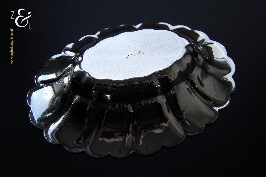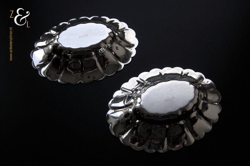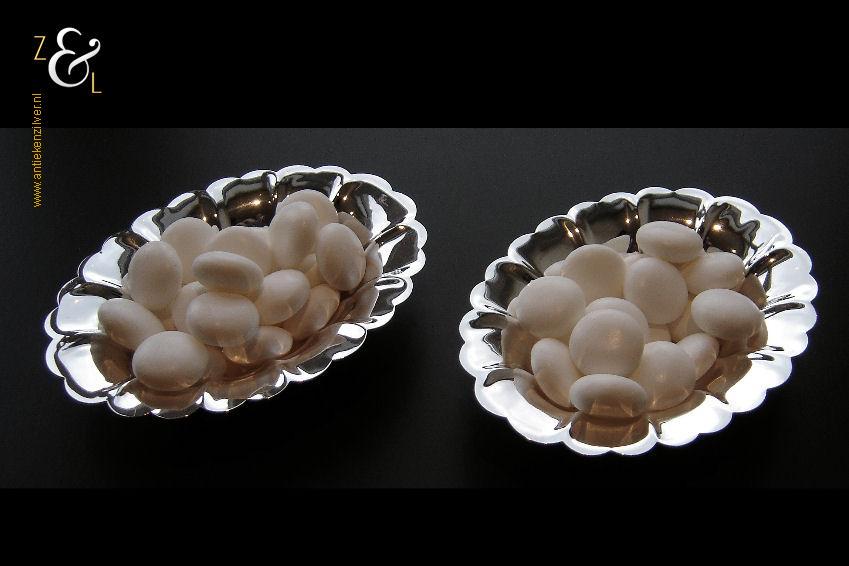 Stel bonbonmandjes / bonbonschaaltjes gemaakt in York Engeland (gekeurd met STERLING). Deze geschulpte sterling zilveren bonbonmandjes wegen samen 80 gram en zijn 10.6 cm lang 8 cm breed en 2 cm hoog. Ook goed te gebruiken als pepermuntmandje voor na het diner.