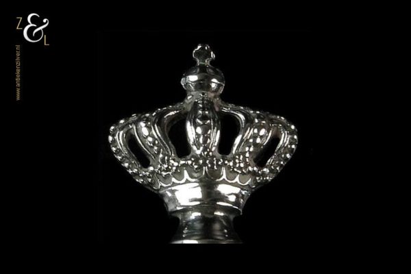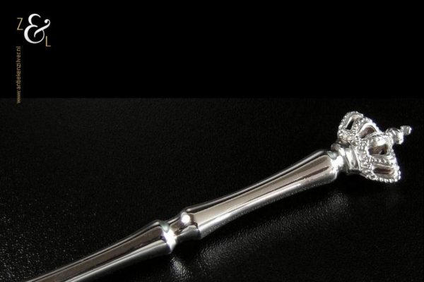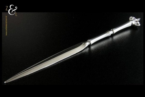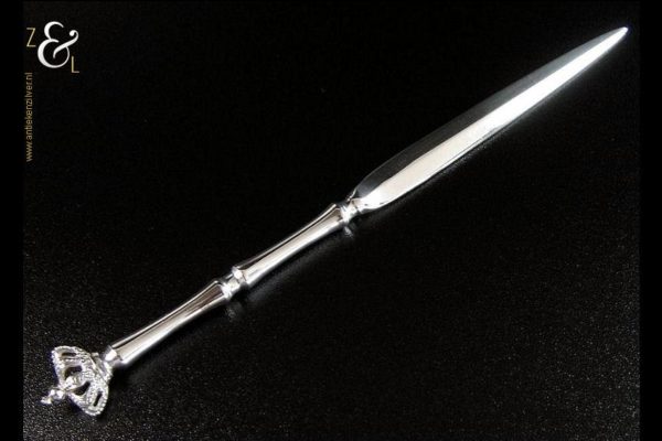 Briefopener gemaakt in Voorschoten / Zoetermeer door de Ateliers voor Edelsmeed en Penningkunst Koninklijke Begeer B.V. (meesterteken B onder kroon in ovaal) gekeurd met het zwaardje sinds 1953. De zilveren briefopener met kroon weegt 53 gram en is 21 cm lang.