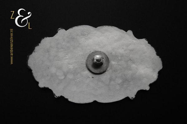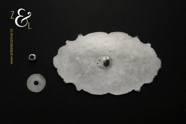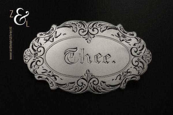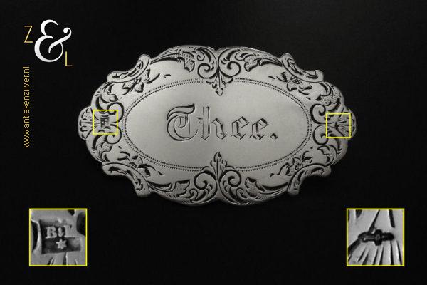 Dit in Biedermeier stijl uitgevoerde label / etiket is gemaakt in Rotterdam door Willem Baksteen & Cornelis Johannes Middendorp (meesterteken B&M boven ster in rechthoek) tussen 1861 en 1889 gekeurd met het zilverkeur zwaardje (dit is het gehaltemerk voor kleine zilveren werken). Het zilveren op de hand gedreven (aan de achterzijde is het gehamerd oppervlak zichtbaar) label / etiket is fijntjes gegraveerd met c-vormige voluten en heeft in gotisch lettertype het opschrift “Thee”. Aan de achterzijde zit een stukje draadeind gesoldeerd zodat men gebruikmakend van het boutje en ringetje het label / etiket op een theekistje of theedoosje kan monteren. Het label / etiket weegt 10 gram en is 6.5 cm lang bij 3.9 cm breed.