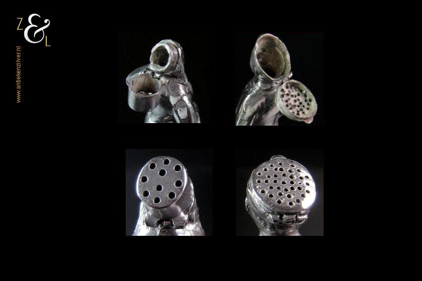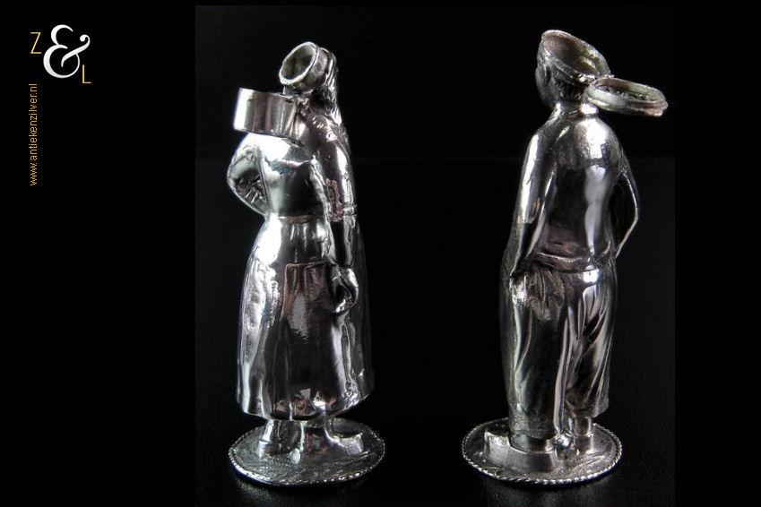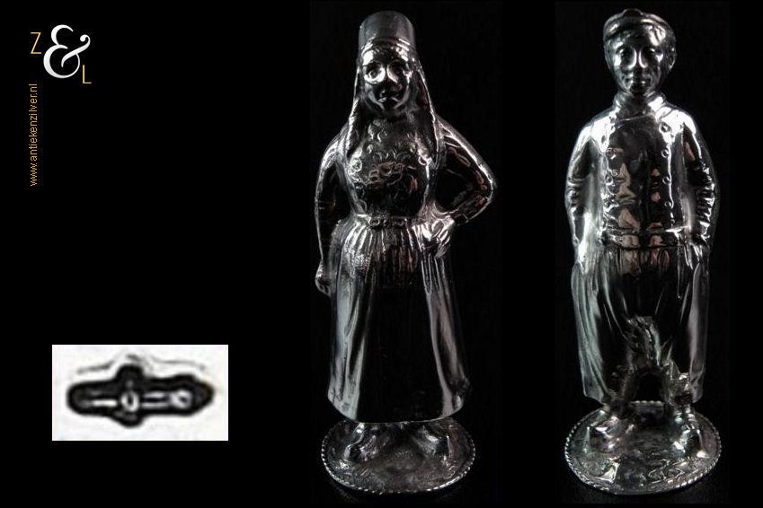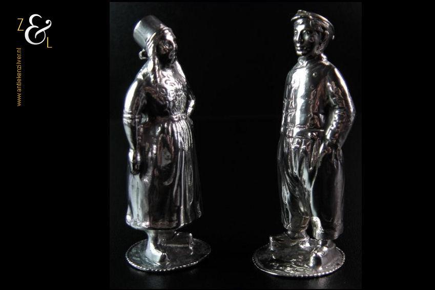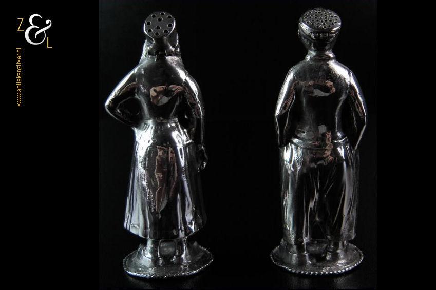 Peper en zout strooier in de vorm van een boer uit Volendam (peper) en boerin uit Marken (zout). De zwaar uitgevoerde zilveren strooibusjes zijn gekeurd met het zilverkeur zwaardje dit is het Nederlandse gehaltemerk voor kleine zilveren werken dat geslagen werd tussen 1906 en 1953. Deze peper en zout strooier (waarbij het meesterteken ontbreekt) zijn vermoedelijk gemaakt bij de Firma J.M. van Kempen & Zonen te Voorschoten die deze strooiers tussen 1906 en 1924 produceerden. De pet van de boer en de muts van de boerin kunnen scharnierend geopend worden om ze te vullen, ze zijn voorzien van grote en kleine gaatjes waardoor men respectievelijk zout en peper kan strooien. De boer en boerin wegen samen 161 gram zijn 9 cm hoog en de voet heeft een diameter van 3.3 cm.