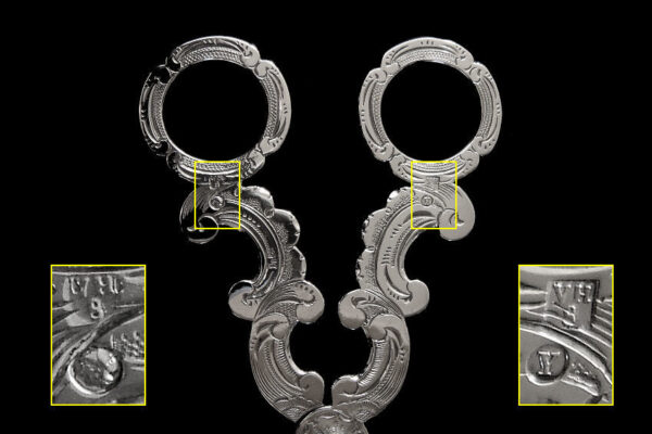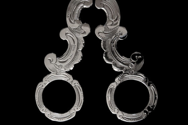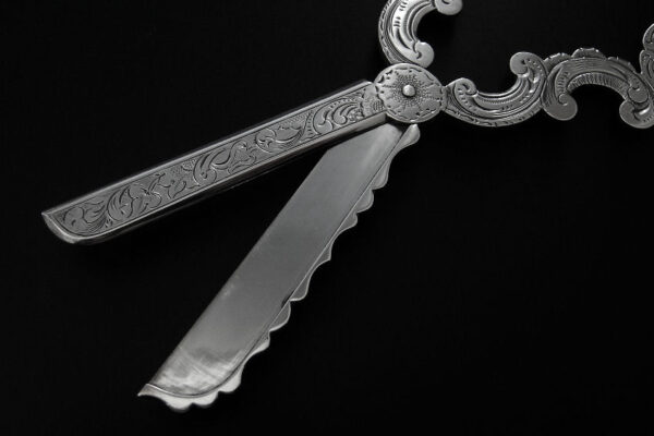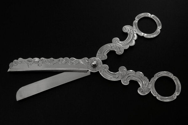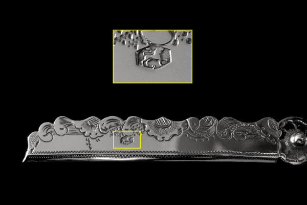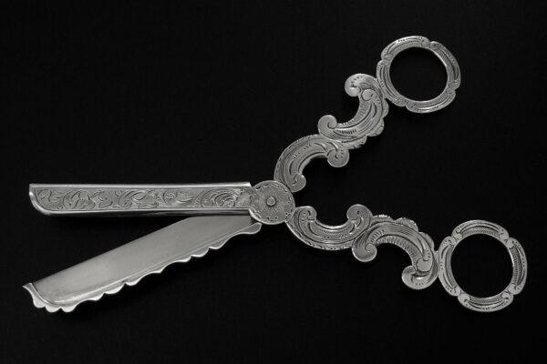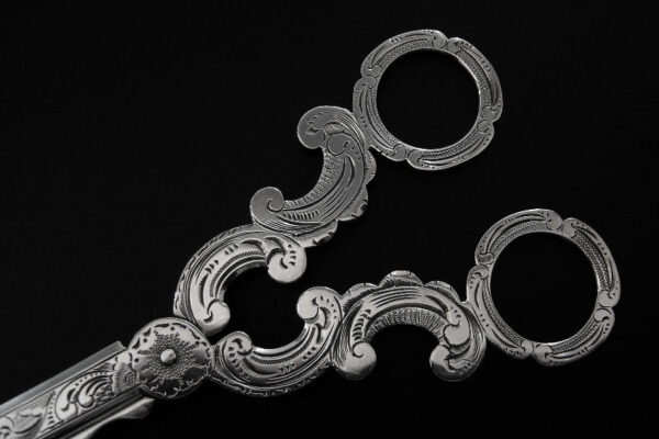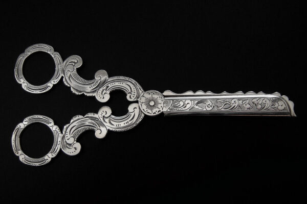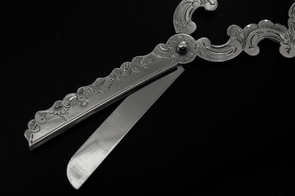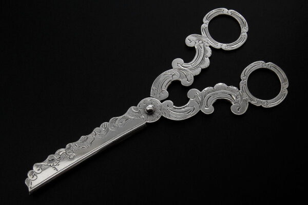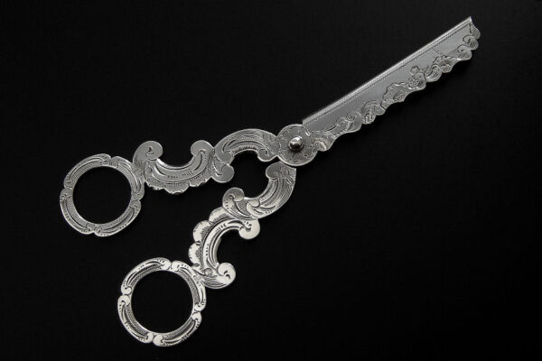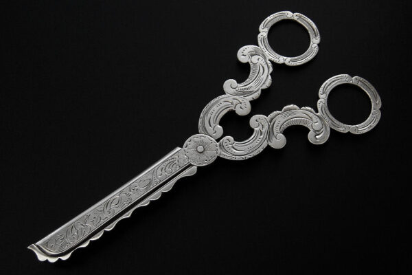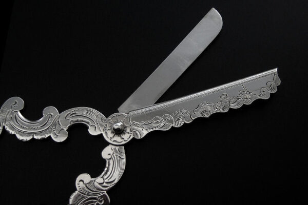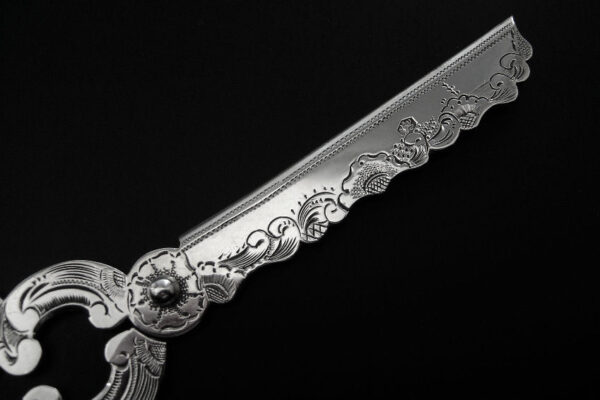 Deze schaar is gemaakt in Utrecht door de zilversmeden Petrus en Hermanus Josephus van Harderwijk (meesterteken VH boven 8 in vierkant) in het jaar 1858 (jaarletter Y). De zilveren in Biedermeier stijl uitgevoerde schaar (die niet knipt!) is vermoedelijk cadeau gegeven als symbool* en dient voor de sier. De schaar die aan twee zijden gegraveerd is met c-vormige voluten en bloemmotieven weegt 79 gram en is 17.3 cm lang bij 7.6 cm breed.