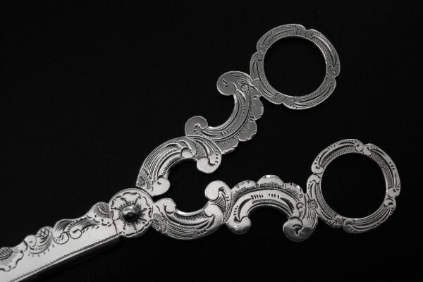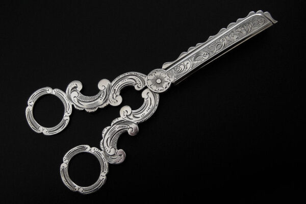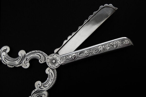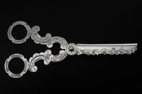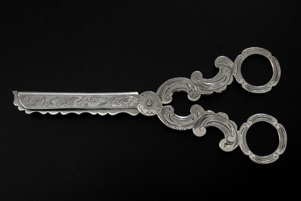 Deze schaar is gemaakt in Utrecht door de zilversmeden Petrus en Hermanus Josephus van Harderwijk (meesterteken VH boven 8 in vierkant) in het jaar 1858 (jaarletter Y). De zilveren in Biedermeier stijl uitgevoerde schaar (die niet knipt!) is vermoedelijk cadeau gegeven als symbool* en dient voor de sier. De schaar die aan twee zijden gegraveerd is met c-vormige voluten en bloemmotieven weegt 79 gram en is 17.3 cm lang bij 7.6 cm breed.