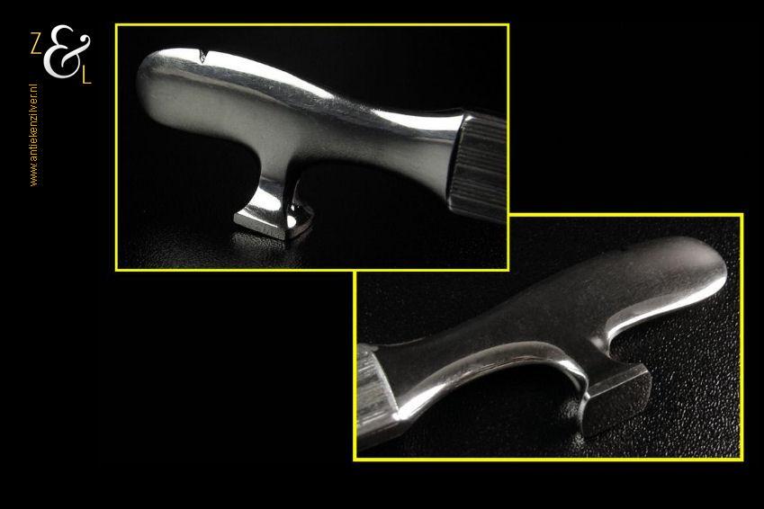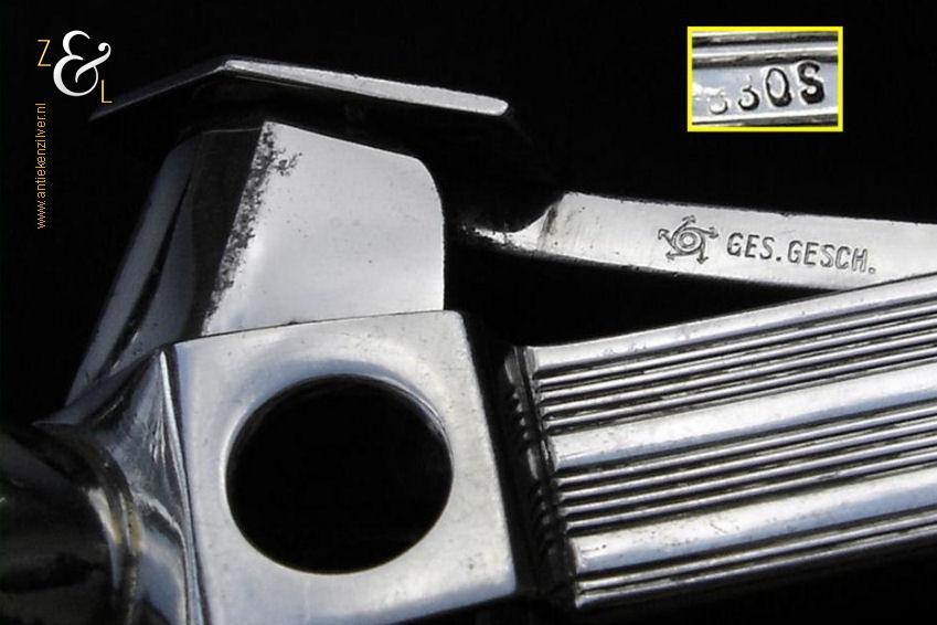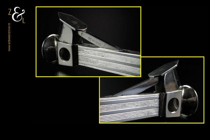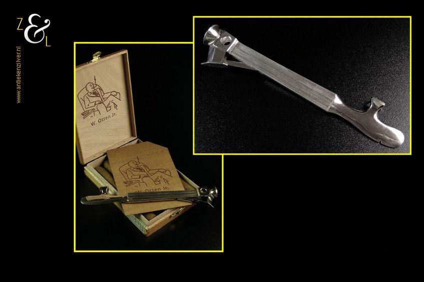 Deze sigarenknipper heeft aan het uiteinde een lepel waarmee men uit een pijp de verbruikte tabak kan verwijderen en een stamper waarmee men tabak in een pijp kan aanstampen (men kan er ook sigarenkisten mee openen en weer afsluiten). De sigarenknipper met stalen knipper en met zilveren montuur is in Duitsland geproduceerd en stamt uit de vijftiger jaren, hij is gestempeld met het zilverkeur 830 dat staat voor 830/1000 2e gehalte zilver en met de afkorting ges. gesch. dat voor gesetzlich geschützt* staat. De sigarenknipper is 16.7 cm lang en weegt 76 gram.