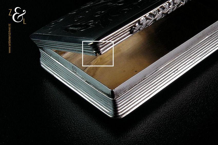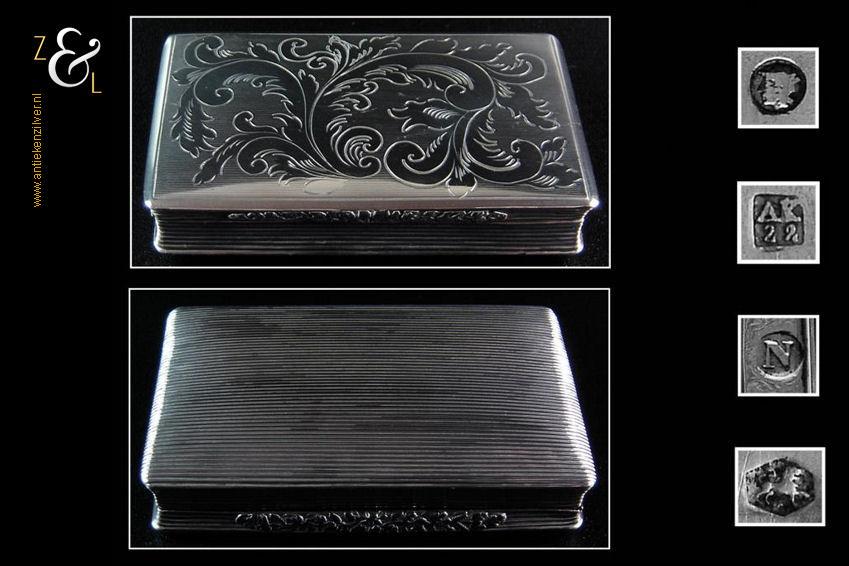Snuifdoos gemaakt in Schoonhoven door Abraham Kruijt (meesterteken AK boven 22 in vierkant) in het jaar 1847 (jaarletter N). Abraham Kruijt was gespecialiseerd in het maken en graveren van doosjes. Van hem zijn ook lodderein- of reukdoosjes, brilledoosjes en tabaksdozen bekend. Deze prachtige zilveren biedermeier snuifdoos heeft een deksel verfraaid met graveerwerk van krullen en rocailles, aan de voorkant van het deksel is een uitstekend randje aangebracht om het openen te vergemakkelijken; dit noemen we een duimstuk, deze doos is uitgevoerd met een bijzondere mooi gevormd duimstuk, de zijkanten van de doos zijn geribd en de bodem heeft een lijnendecor in guillocheer techniek tevens zijn aan de binnenkant sporen van verguldsel te vinden, dit was om het zilver te beschermen tegen het aantasten van het snuiftabak. De doos weegt 60 gram is 8.2 cm lang 4.9 cm breed en 1.6 cm hoog. Er zit een kleine beschadiging op een hoek van het deksel zie inzet foto 4.