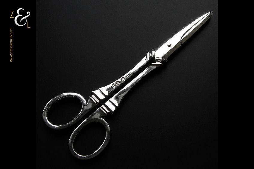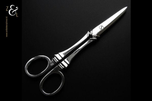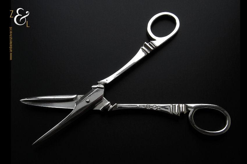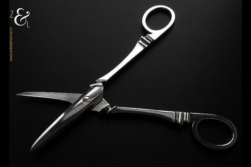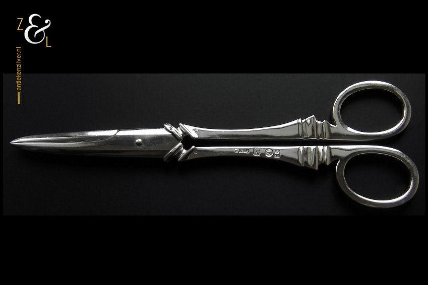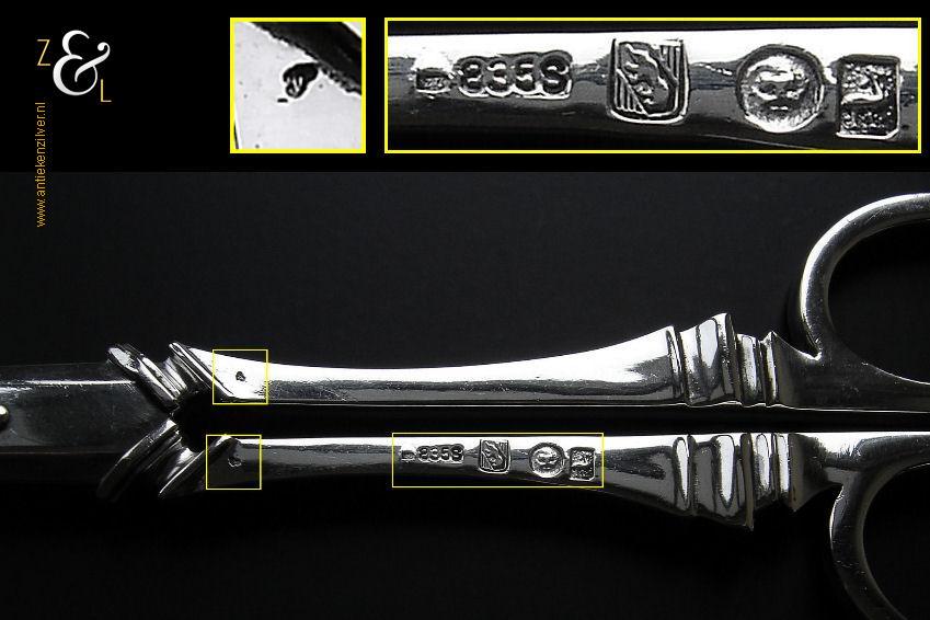 Druivenschaar gemaakt in Bremgarten Zwitserland. De zilveren Art Deco druivenschaar draagt de keuren uit Zwitserland en is twee maal (op iedere helft van de schaar) gemerkt met het oude Nederlandse belastingstempel V dat van 1906 tot 1953 voor buitenlandse werken gold. Tevens is de druivenschaar bij import in Nederland gekeurd met het zilverkeur ZII (zilver 835 duizendsten) dit stempel werd gebruikt voor gehaltemerken sinds 1-9-1953 voor voorwerpen in voltooide staat aangeboden. De druivenschaar weegt 83 gram en is 15.7 cm lang bij 5.1 cm breed.