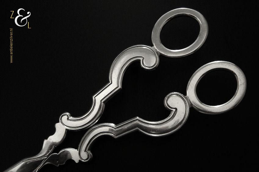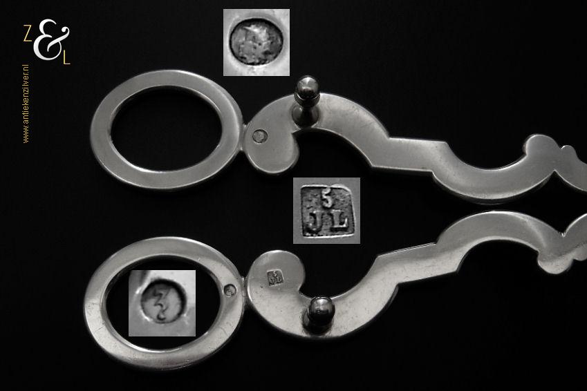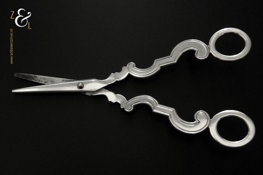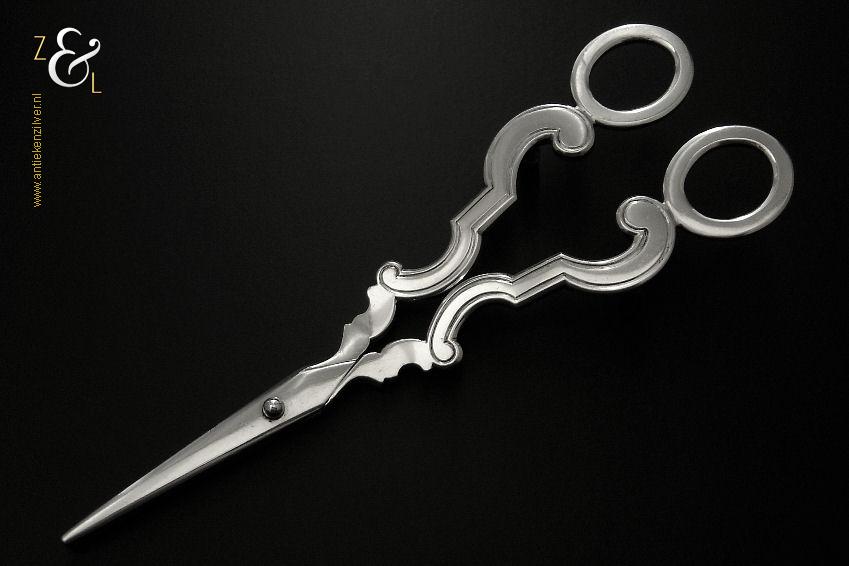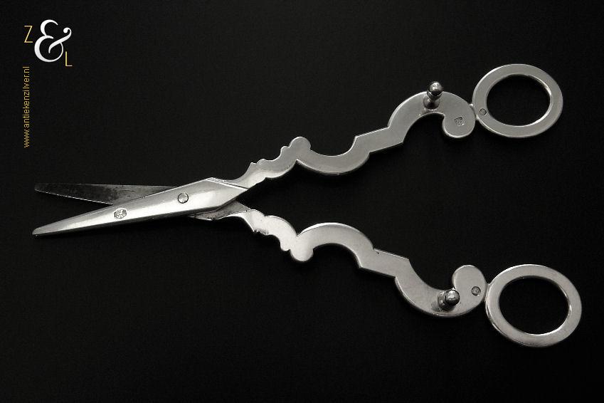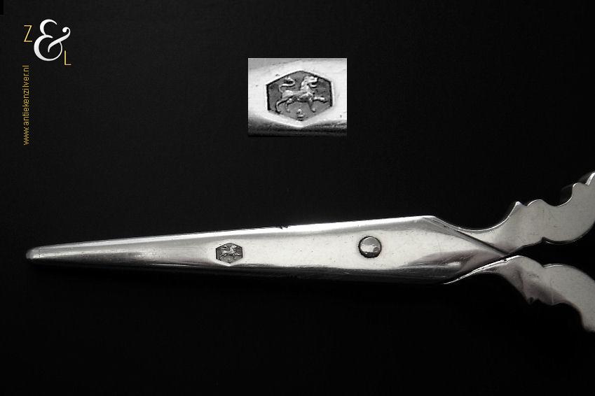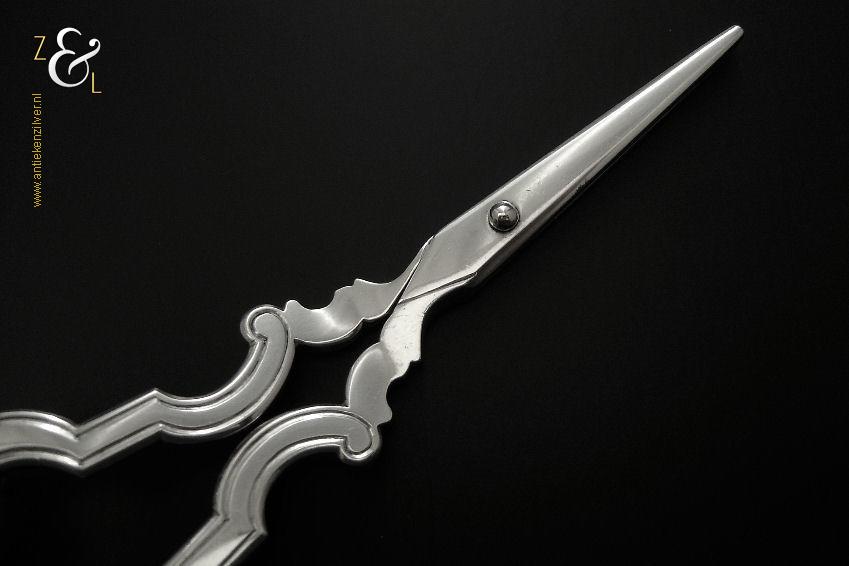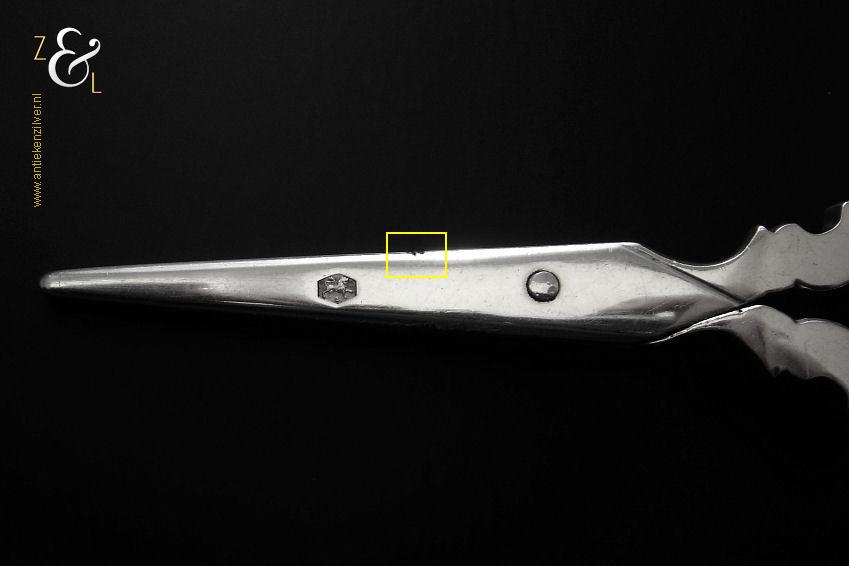 Schaar gemaakt in Amsterdam door Jilles Limburg (meesterteken JL onder 5 in vierkant) in het jaar 1884 (jaarletter Z). Deze met filetrand uitgevoerde zware zilveren Neostijl schaar heeft stalen messen. De pennen die aan de onderzijde van de schaar zijn gesoldeerd maken het mogelijk om deze eenvoudig van tafel te kunnen oppakken. De schaar weegt 107 gram is 18 cm lang bij 6.1 cm breed. De schaar heeft bij het knipgedeelte een kleine beschadiging (zie foto met geel omkaderd gedeelte).