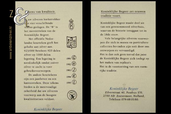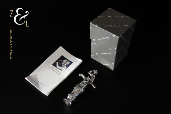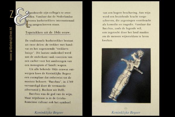 Deze kurkentrekker is gemaakt in Voorschoten / Zoetermeer door de Ateliers voor Edelsmeed en Penningkunst – De Koninklijke Begeer B.V. (meesterteken B onder kroon in ovaal) in het jaar 1992 (jaarletter H). De 1e gehalte zilveren kurkentrekker model Bacchus* is een replica uit 1769 gemaakt door zilversmid Jan Reghter uit Delft en bestaat uit twee delen; de trekker met handvat en het zogenaamde trekkershuisje waarin de trekker kan worden opgeborgen. De kurkentrekker is nooit gebruikt en heeft de nog originele verpakking (doosje) en folder van De Koninklijke Begeer. De kurkentrekker weegt 82 gram en is 8.4 cm lang bij 3.9 cm breed. De kurkentrekker is aan de onderzijde van het trekkershuisje gegraveerd met een logo (zie foto met blauw omkaderd gedeelte).