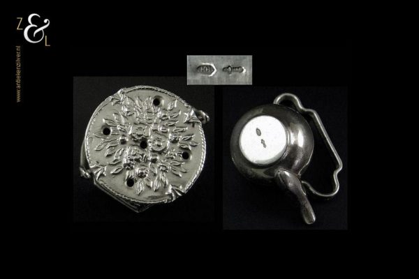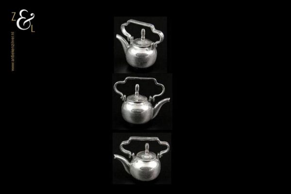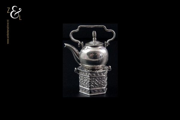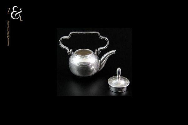 Miniatuur van een ketel en stoof. Het keteltje is gemaakt in Schoonhoven door de Schoonhovensche Zilverfabriek H. Hooijkaas B.V. (meesterteken *H.H* in langwerpige zeshoek). Het stoofje heeft het keur voor ongewaarborgd oud en inlands zilver en is gemaakt tussen 1906 en 1953. Deze zilveren miniatuur ketel en stoof wegen samen 16 gram, het keteltje is 2.6 cm hoog en het stoofje is 1.6 cm hoog en heeft een diameter van 2.1 cm.