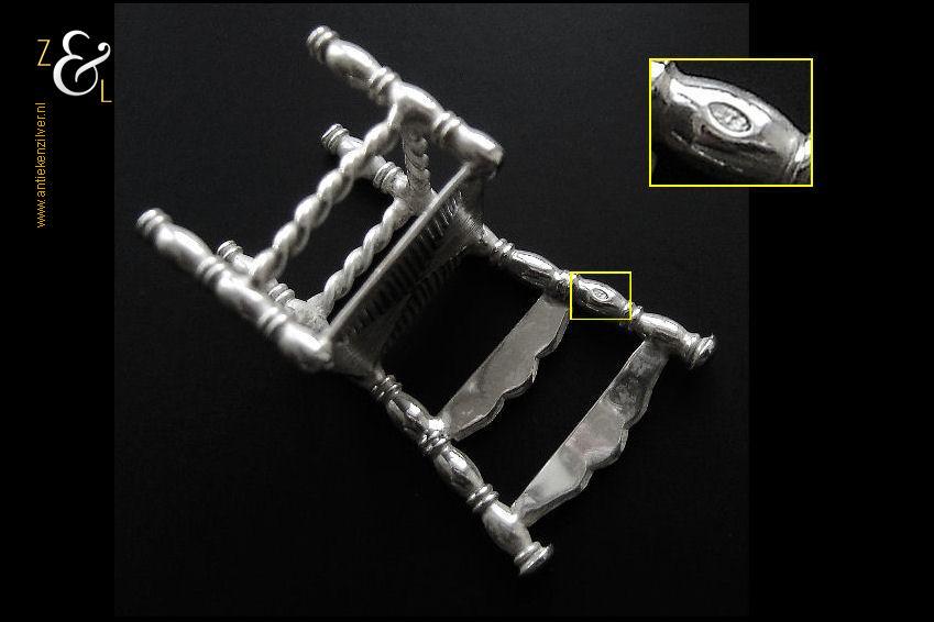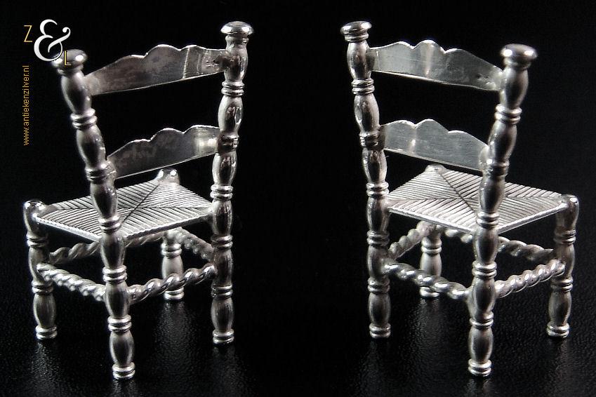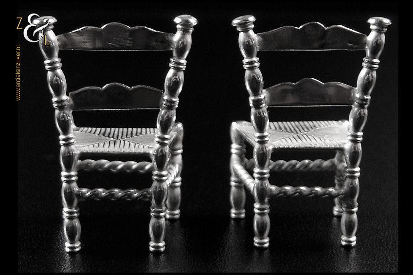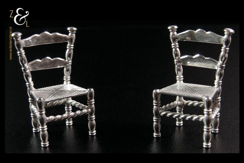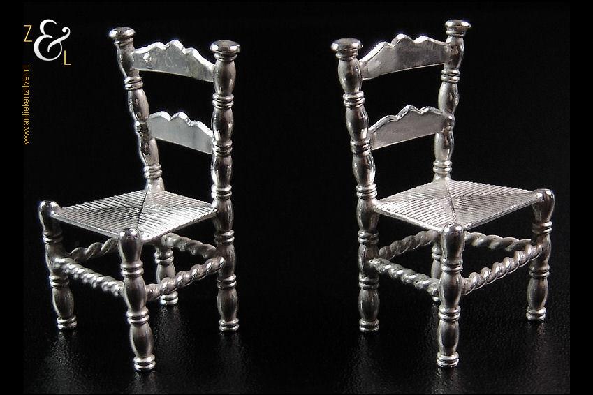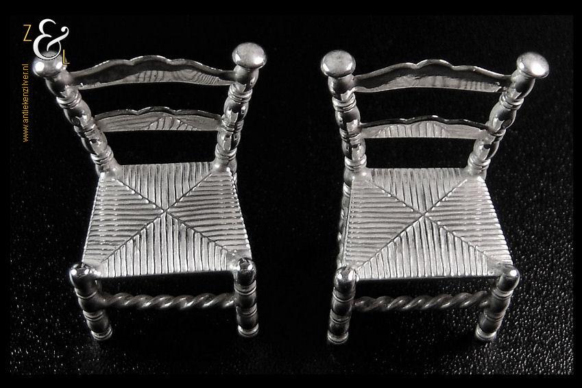 Miniatuur van twee stoelen gemaakt in Haarlem / Amsterdam door de Zaanlandse zilversmederij N.V. / B.V. (meesterteken Z hamer Z in ellips) tussen 1920 en 1953 (gekeurd met het zilverkeur zwaardje). Deze zilveren miniatuur stoelen wegen samen 26 gram en zijn 2.2 cm lang 1.8 cm breed 4.1 cm hoog.