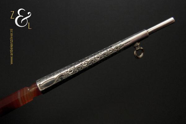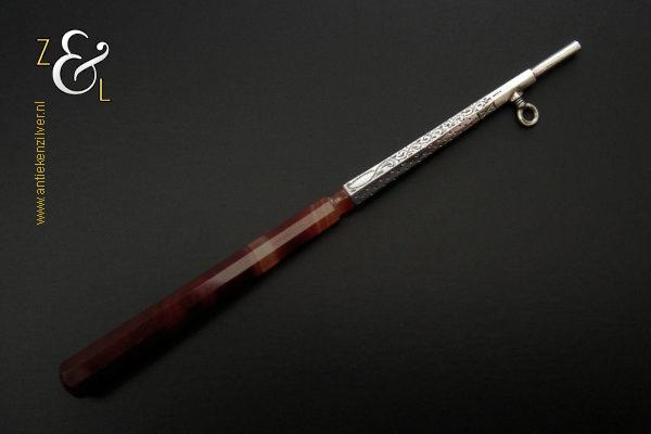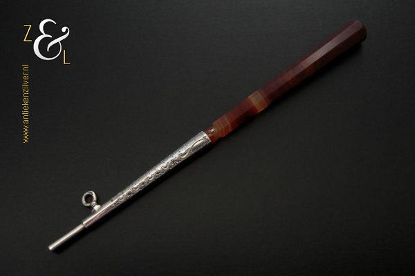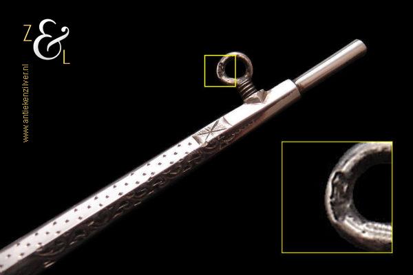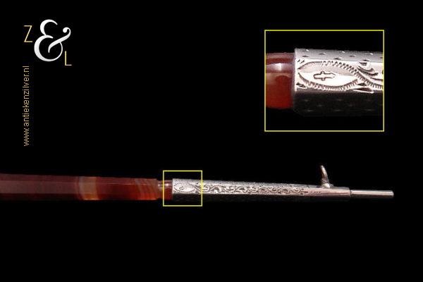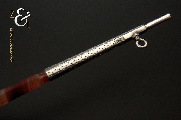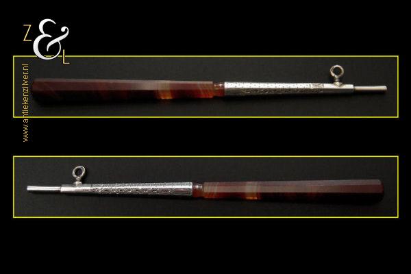 Deze haaknaaldhouder voor een tamboereernaald is gemaakt in Nederland omstreeks 1880 en is gekeurd met het zilverkeur zwaardje dat tussen 1814 en 1905 in gebruik was. Het zilverkeur zwaardje is zowel op de haaknaaldhouder als op het oogje waarmee je de naald vastzet geslagen. De zilveren haaknaaldhouder die fijntjes gegraveerd is heeft een achtkantig geslepen streepagaten handvat weegt 10 gram en is 12.7 cm lang.