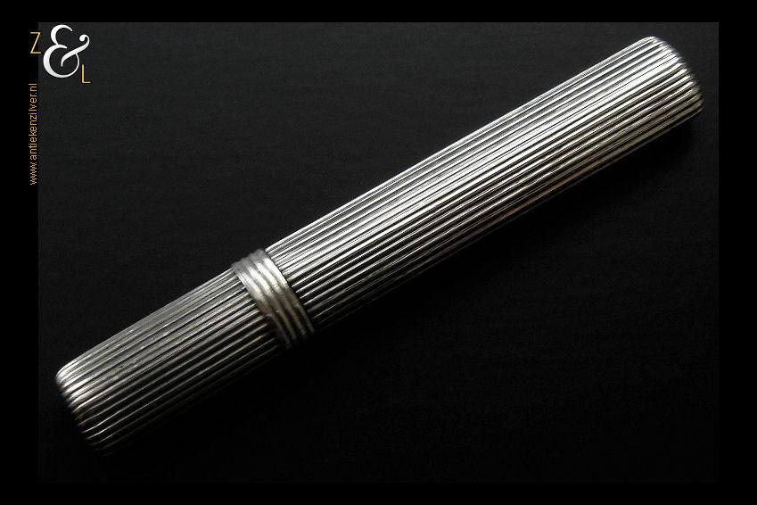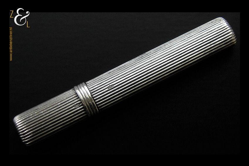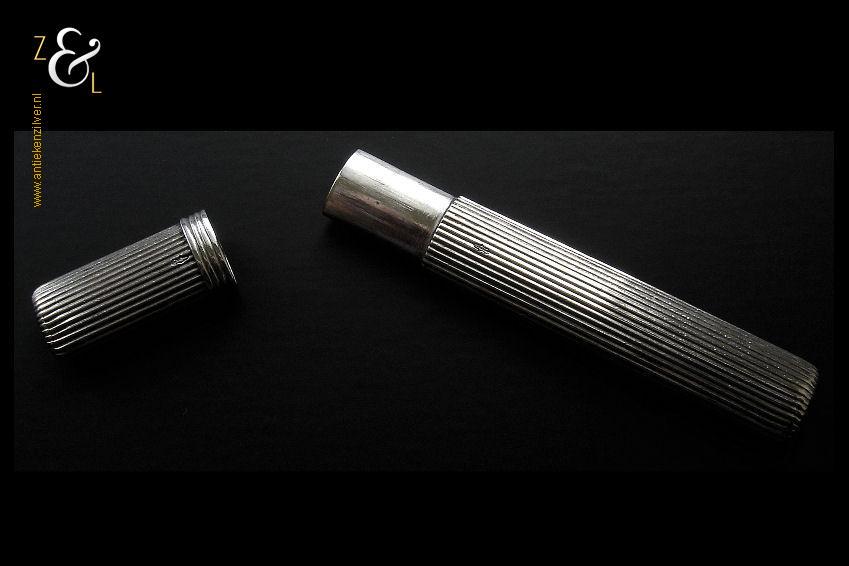 Deze naaldenkoker is gemaakt in Nederland en is gekeurd met het zilverkeur zwaardje dit is een gehaltemerk voor zilveren voorwerpen dat in de periode tussen 1814 en 1905 in gebruik was. De ovale geribde zilveren naaldenkoker is 6.9 cm lang en weegt 8 gram.