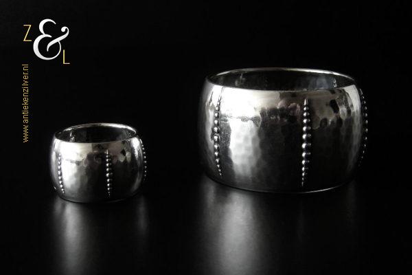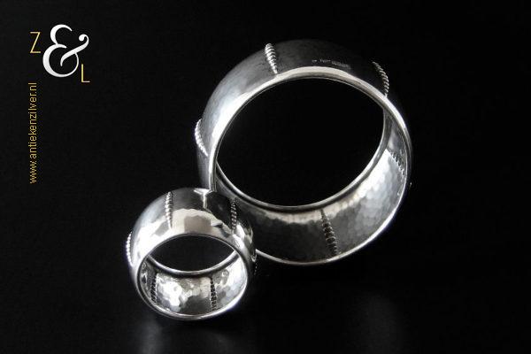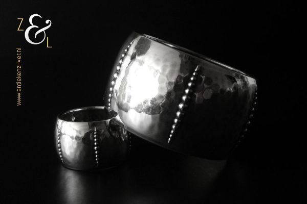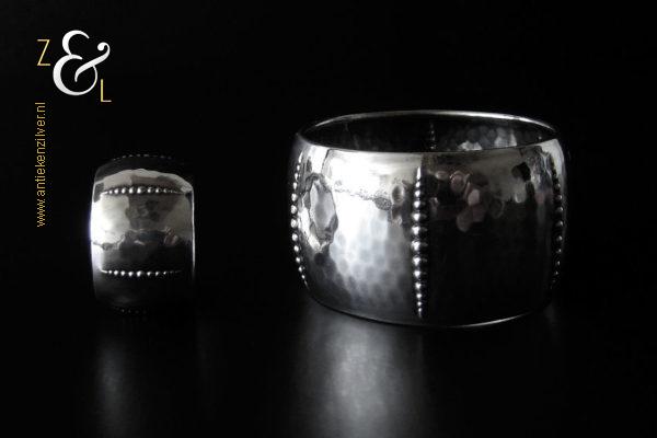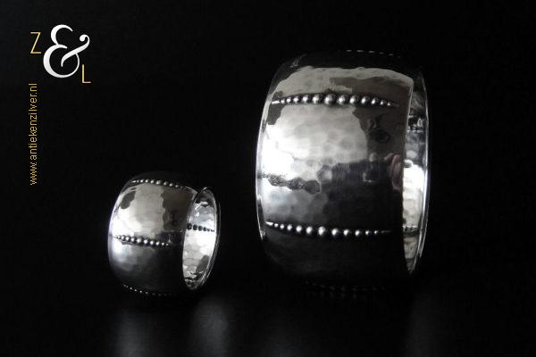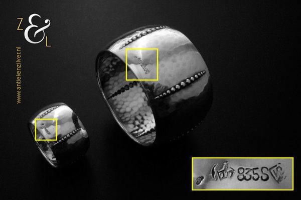 Deze set van één servetring en één vingerdoekring is in de eerste helft van de 20e eeuw gemaakt in Pforzheim Duitsland door de Zilverfabriek Lutz & Weiss (meesterteken LW in schild). Tevens zijn de gehamerde in Art Deco stijl uitgevoerde servet- en vingerdoekring gemerkt met het oude Nederlandse belastingstempel V dat van 1906 tot 1953 voor buitenlandse werken gold en met het Duitse zilverkeur “halve maan en kroon” met daarachter 835 S die de fijnheid van het zilver in duizendsten aangeeft 835/000 = 2e gehalte zilver, deze manier van keuren is in Duitsland geünificeerd in 1888, dit garantiesysteem is tegenwoordig nog steeds in gebruik. De servetring heeft een diameter van 5.5 cm en is 3 cm breed en de vingerdoekring heeft een diameter van 3 cm en is 1.7 cm breed samen wegen ze 26 gram. De servet- en vingerdoekring hebben lichte gebruikssporen.