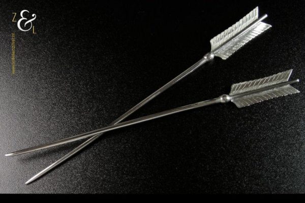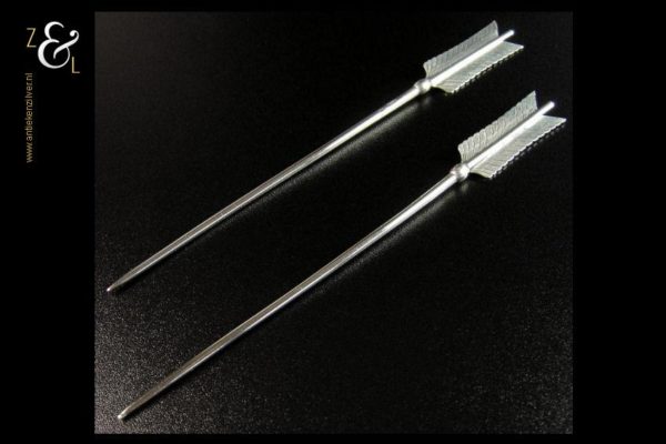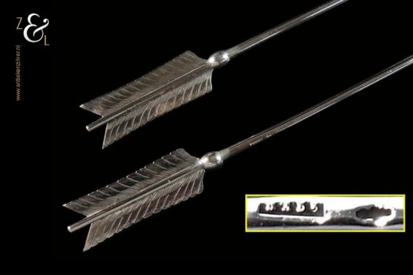 Deze set van twee vleespennen of spiesen waarvan het meesterteken gedeeltelijk leesbaar is (..55 in rechthoek) heeft het zilverkeur van het zwaardje dat tussen 1814 en 1905 in Nederland gebruikt is en stamt uit de 19e eeuw. De zilveren vleespennen in de vorm van pijlen zijn 18.7 cm lang en wegen samen 36 gram.