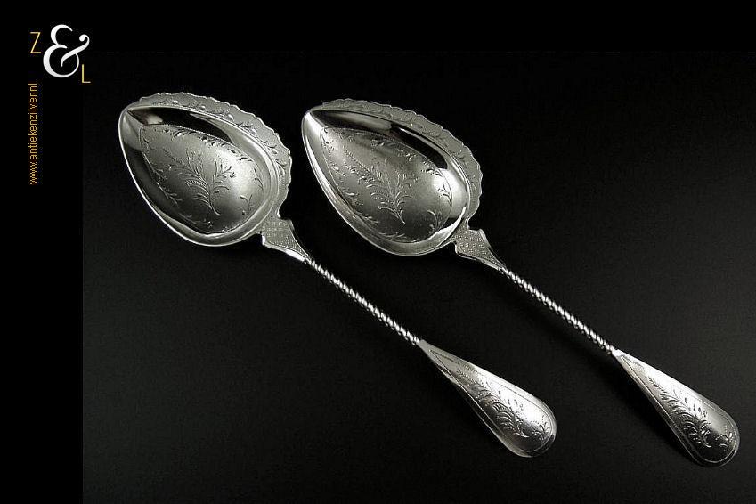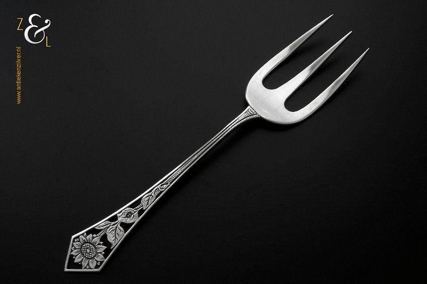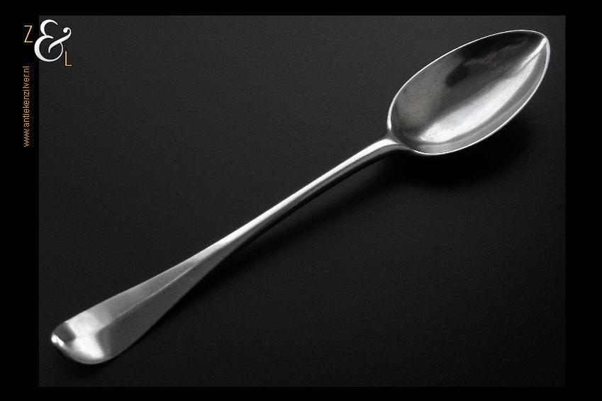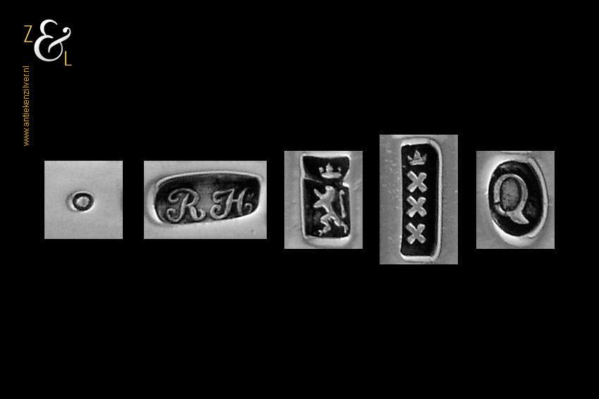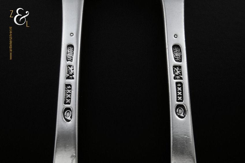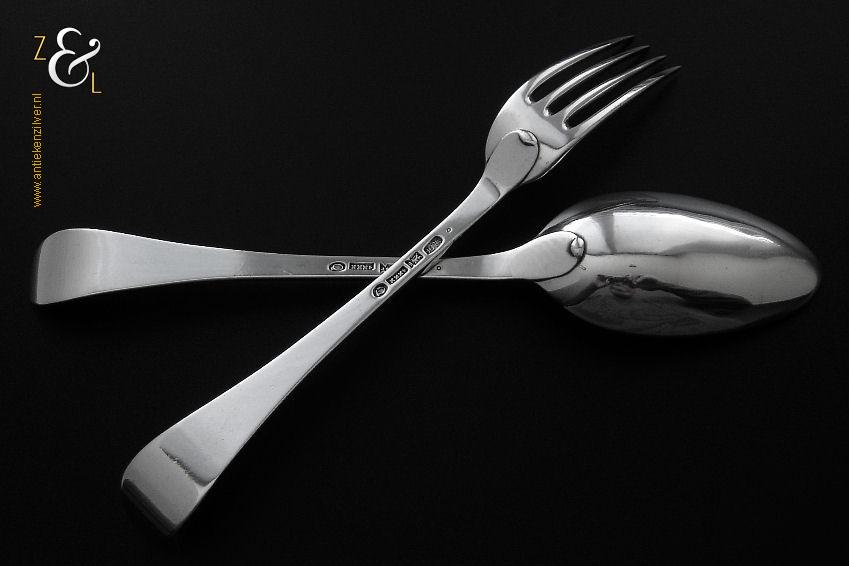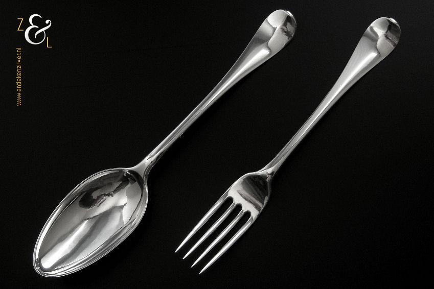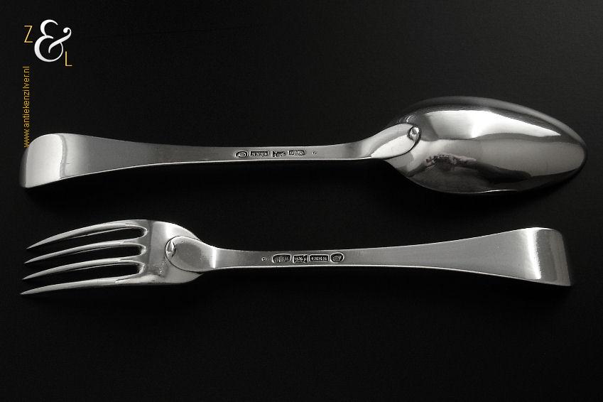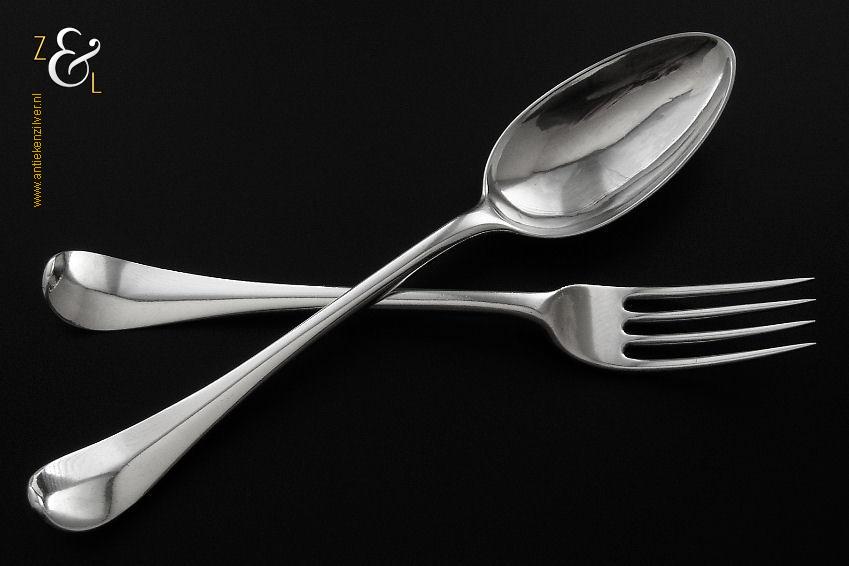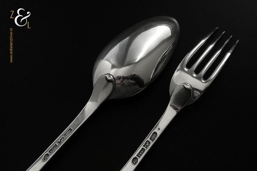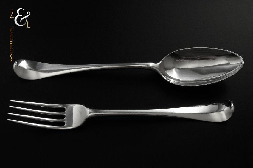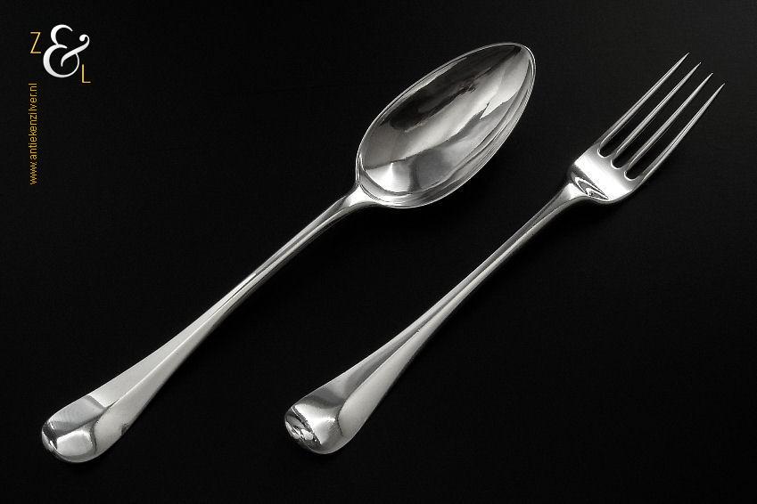Dit handgesmede dinercouvert is gemaakt in Amsterdam door Roelof Helweg (meesterteken RH in afgeronde rechthoek) in het jaar 1799 (jaarletter Q). Tevens heeft dit antieke zilveren dinercouvert het stempel van een O waarschijnlijk is dit een oud herkeur, de staande gekroonde leeuw dat het eerste gehalte zilver aangeeft en het stempel drie Andreaskruisen met kroon het stadskeur voor Amsterdam. Het in model dik Haags lof uitgevoerde dinercouvert waarvan de vork 19.8 cm lang is en de lepel 21.1 cm lang is weegt 143 gram. De lepelbak is 4.1 cm breed bij 7.9 cm lang.