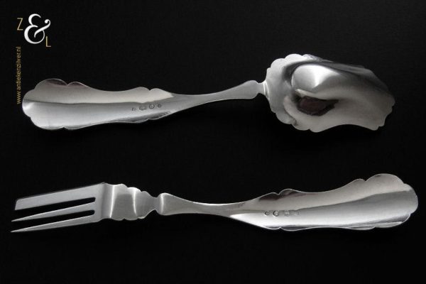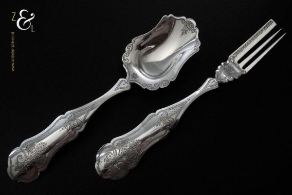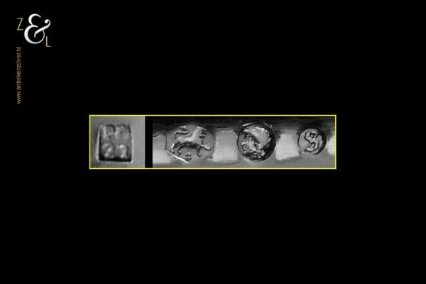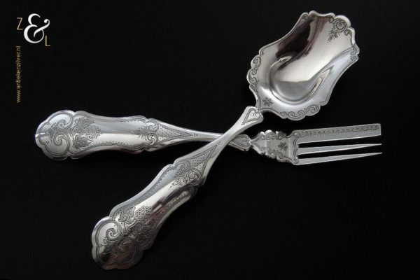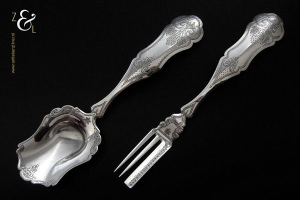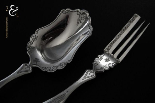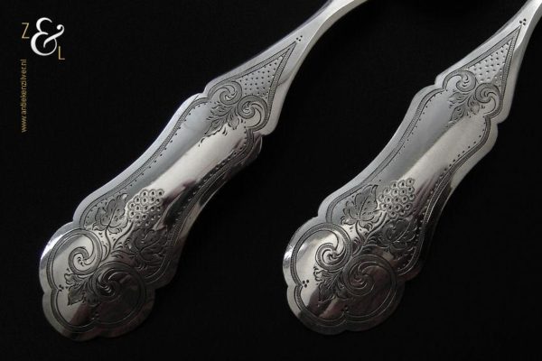 Gembercouvert gemaakt in Schoonhoven door Pieter van Geelen Ez. (meesterteken PG boven 21 in vierkant) in het jaar 1877 (jaarletter S). Dit in Biedermeier uitgevoerde zilveren gembercouvert heeft een gravering van druivenbladeren en druiventrossen. Het gembercouvert weegt 80 gram en is 19.3 cm lang. De royale lepelbak is 7 cm lang en 4.9 cm breed.