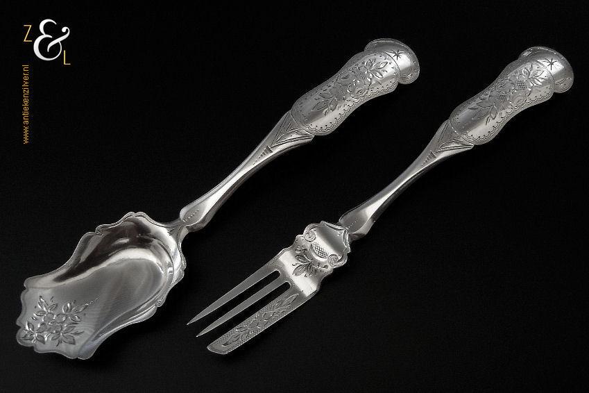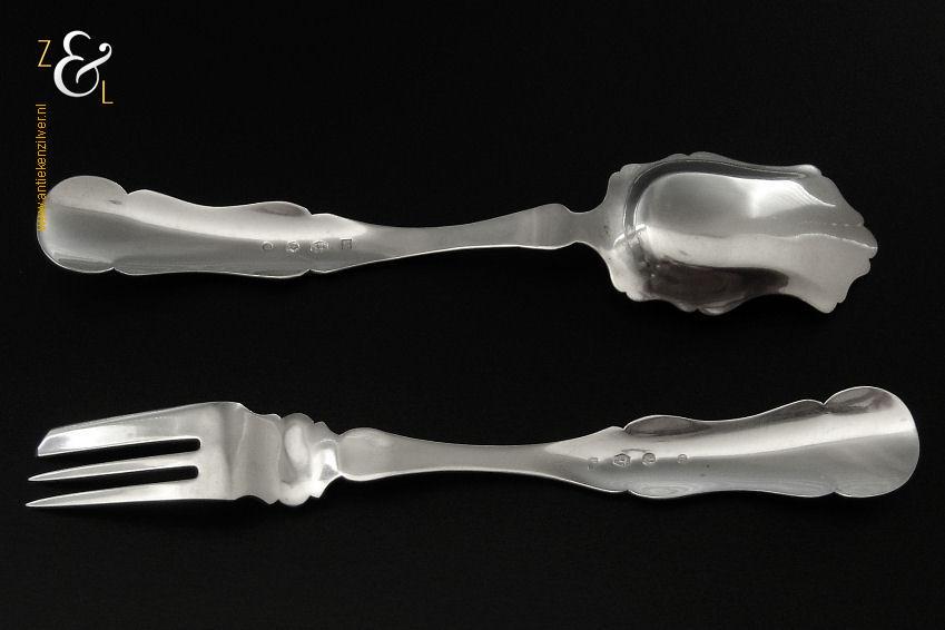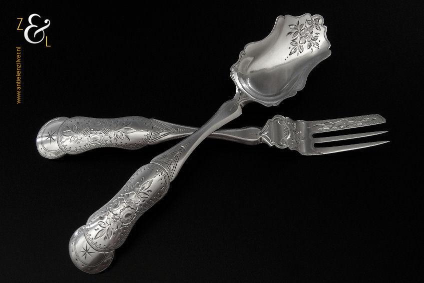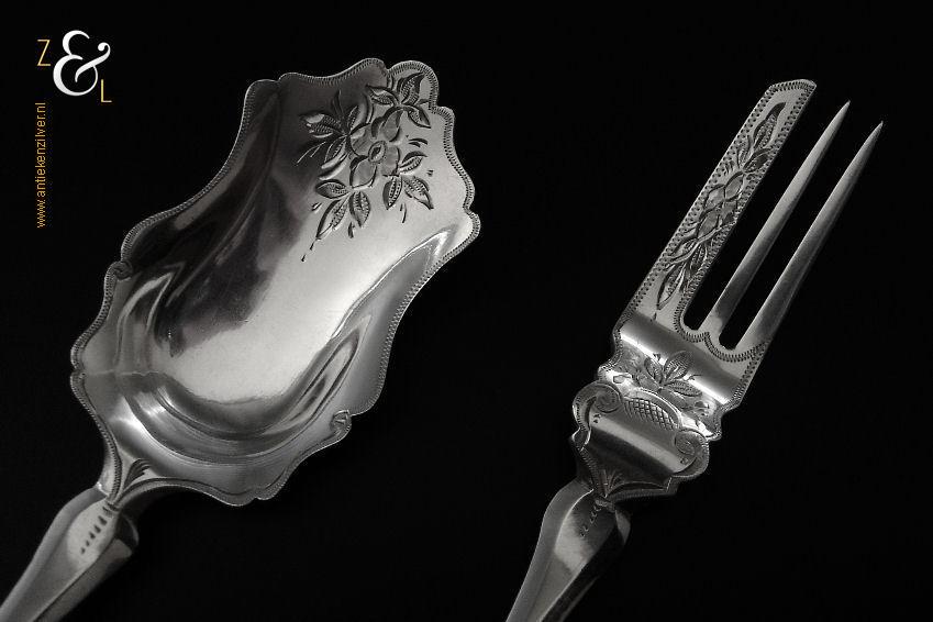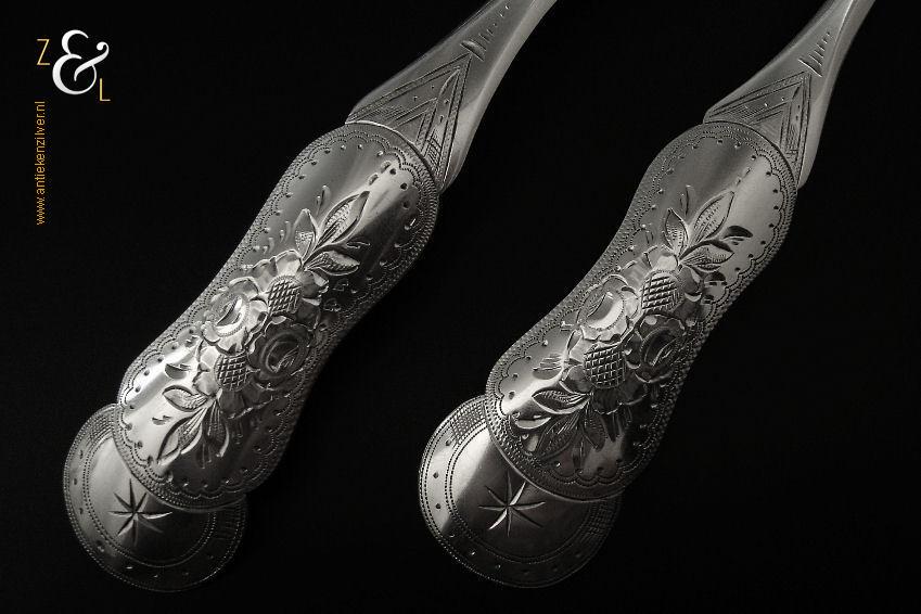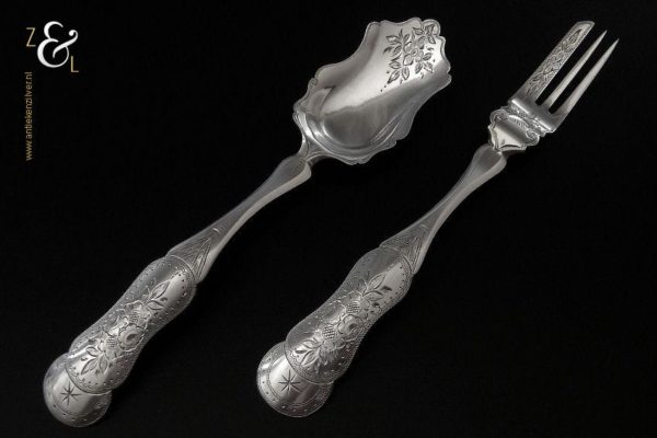 Gembercouvert gemaakt in Voorschoten bij de Firma J.M. van Kempen & Zonen (meesterteken liggend maantje boven VK in vierkant) in het jaar 1861 (jaarletter B). Dit in Biedermeier uitgevoerde zilveren gembercouvert heeft een diepe gravering van bloem- en bladmotieven en aan het uiteinde van de handvatten is een ster gegraveerd. Het gembercouvert weegt 66 gram en is 19.6 cm lang.