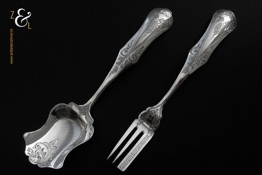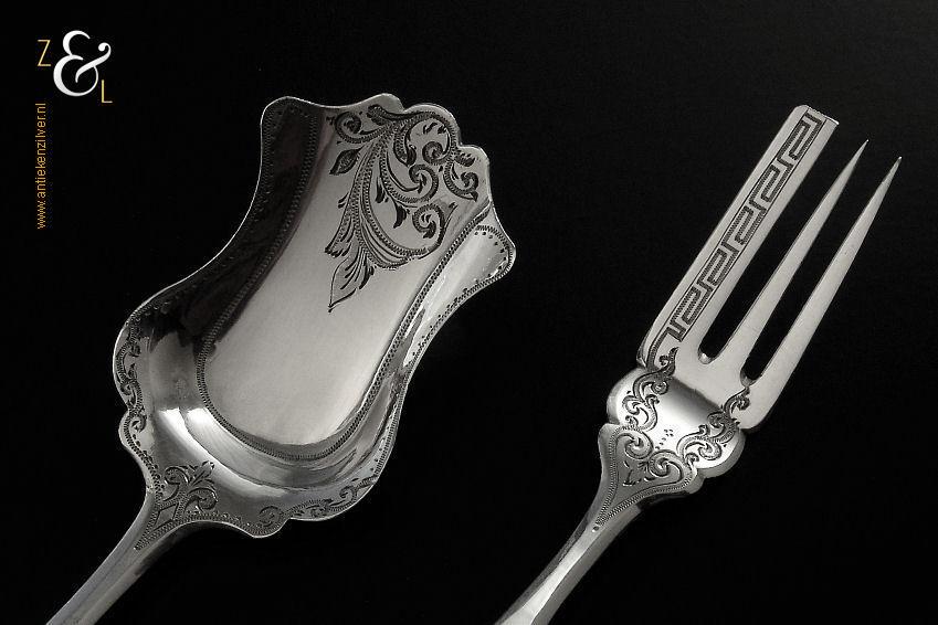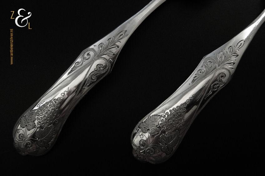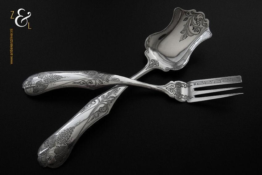 Gembercouvert gemaakt in Schoonhoven door Pieter Coenraad Burghoorn (meesterteken P.C. boven B * in vierkant) in het jaar 1886 (jaarletter B). Dit in Biedermeier uitgevoerde zilveren gembercouvert heeft op de handvatten een gravering van druivenbladeren en druiventrossen. Het gembercouvert weegt 37 gram en is 16.4 cm lang.