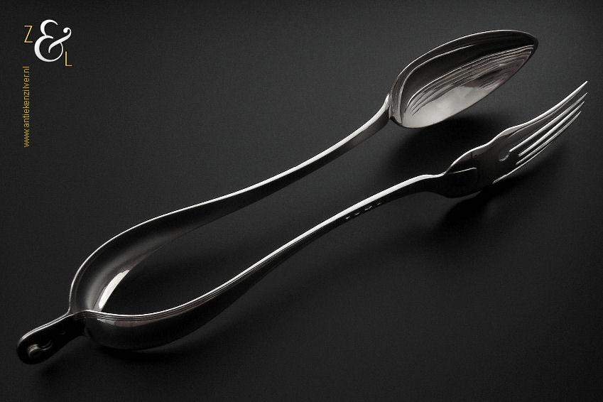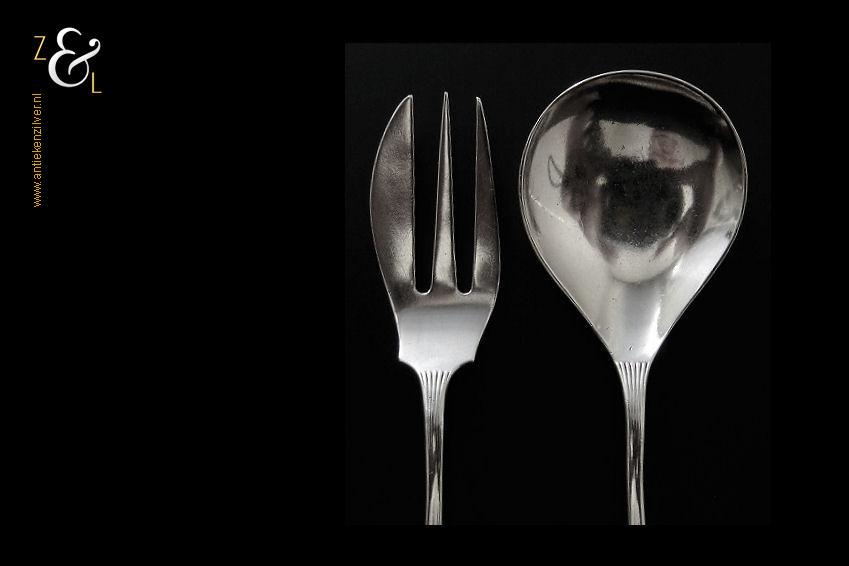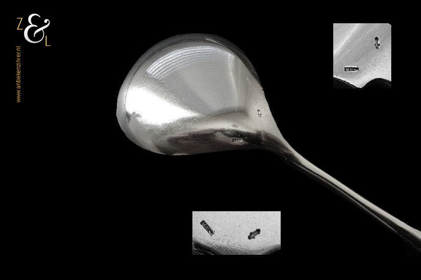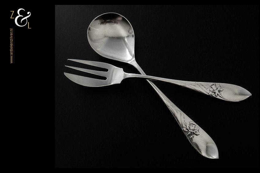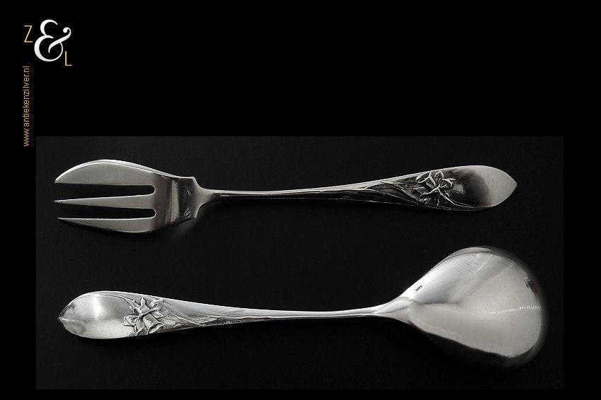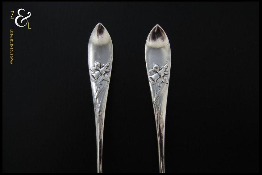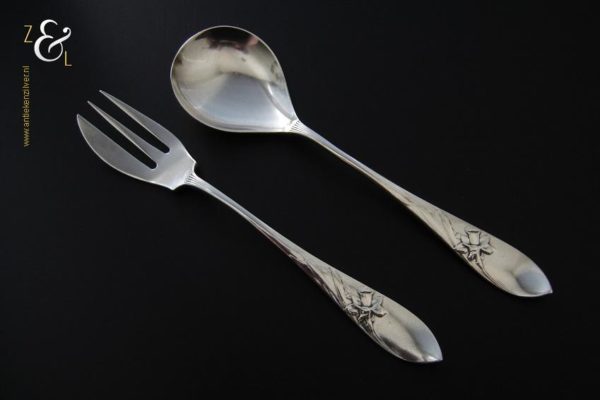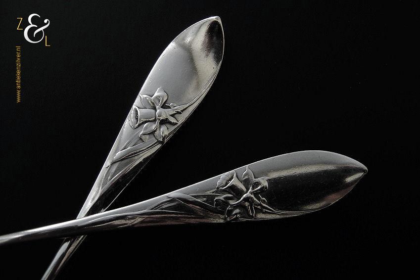 Gembercouvert gemaakt in Voorschoten door de Firma J.M. van Kempen & Zonen (meesterteken VK liggend maantje in rechthoek) tussen 1906 en 1924. Dit in Art Deco uitgevoerde zilveren couvert heeft zowel aan de voor als achterkant van de stelen een decoratie van narcissen. Het gembercouvert weegt 80 gram en is 16.7 cm lang.