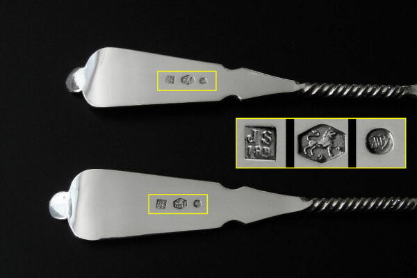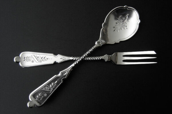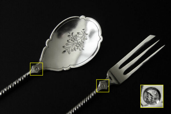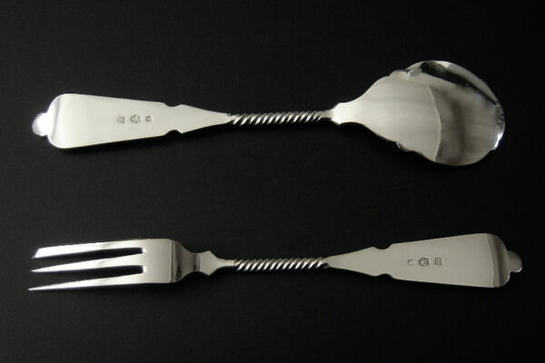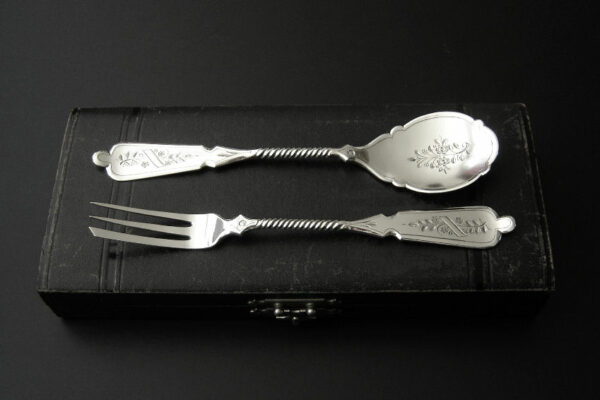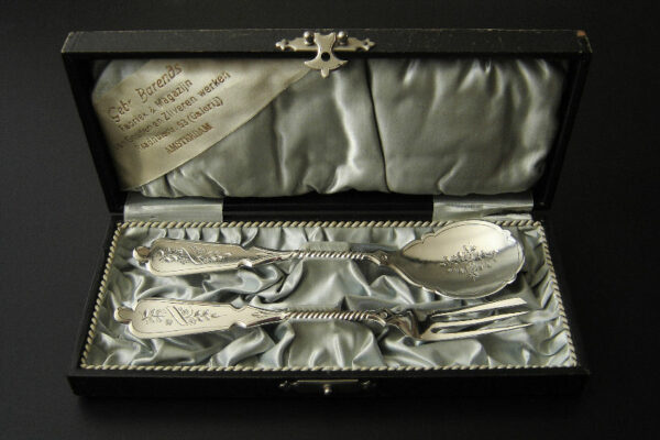 Gembercouvert gemaakt in Woudsend / Sneek door Johannes Schijfsma (meesterteken JS boven 189 in vierkant) in het jaar 1896 (jaarletter M). Het gembercouvert heeft het originele zwarte foedraal (heeft lichte gebruikssporen) dat aan de binnenzijde een lichtblauw geplooid zijden interieur heeft. Aan de binnenkant van het deksel is op een wit zijden lint in glanzend goud gedrukt: Gebr. Barends Fabriek & Magazijn van Gouden en Zilveren werken Raadhuisstr. 53 (Galerij) Amsterdam (de verkopende winkelier). Het in Jugendstil uitgevoerde zilveren gembercouvert heeft getordeerde stelen en de bak van de lepel en de handgrepen hebben een gravering van bloemmotieven en zijn gematteerd (matteren is een bewerking waarbij de zilversmid het oppervlak van een zilveren voorwerp een matte structuur geeft). Het gembercouvert weegt 72 gram is 18.1 cm lang en de lepelbak is 7 cm lang bij 4.2 cm breed. Het foedraal is 22 cm lang bij 9.5 cm breed bij 3.5 cm hoog.