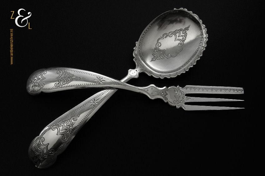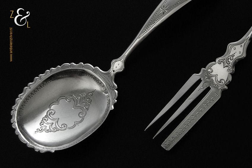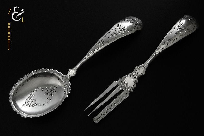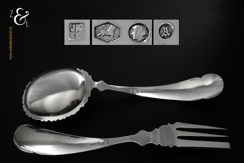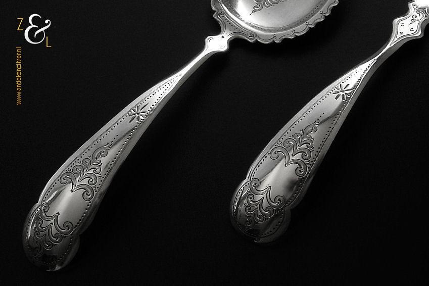 Gembercouvert gemaakt in Schoonhoven door Jacob Kooiman (meesterteken JK. boven 1 in vierkant) in het jaar 1885 (jaarletter A). Dit zilveren Jugendstil gembercouvert is geheel gegraveerd en heeft een cartouche in de met accoladerand uitgevoerde lepelbak. Het gembercouvert weegt 53 gram en is 17.9 cm lang. De lepelbak is 7 cm lang bij 5.1 cm breed.