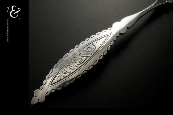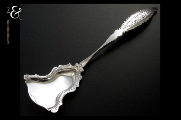 Deze gemberlepel is gemaakt in Den Bosch / ‘s-Hertogenbosch door Antonius Hendrikus der Kinderen (meesterteken DK boven 44 in vierkant) in het jaar 1859 (jaarletter Z). De zilveren Biedermeier gemberlepel weegt 32 gram en is 19.8 cm lang. De lepelbak is 6.5 cm lang bij 5.5 cm breed. De gemberlepel heeft twee kleine breukjes aan de achterzijde van de steel die niet door en door zijn.