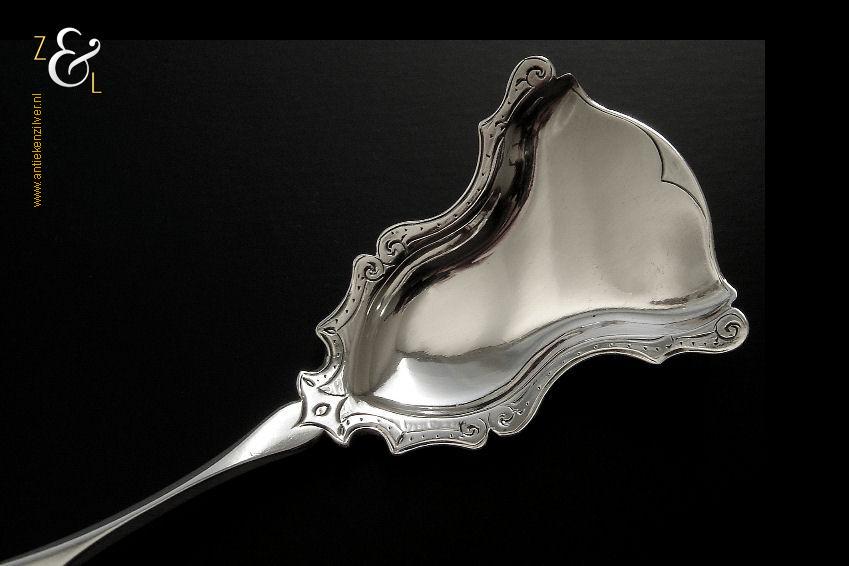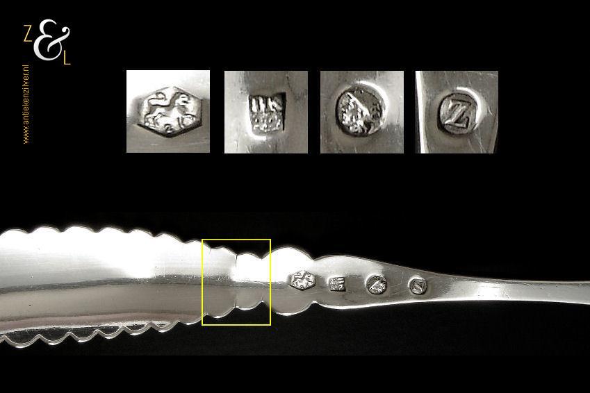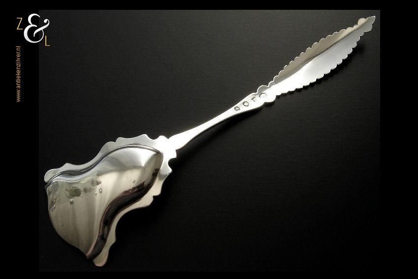 Deze gemberlepel is gemaakt in Den Bosch / ‘s-Hertogenbosch door Antonius Hendrikus der Kinderen (meesterteken DK boven 44 in vierkant) in het jaar 1859 (jaarletter Z). De zilveren Biedermeier gemberlepel weegt 32 gram en is 19.8 cm lang. De lepelbak is 6.5 cm lang bij 5.5 cm breed. De gemberlepel heeft twee kleine breukjes aan de achterzijde van de steel die niet door en door zijn.
