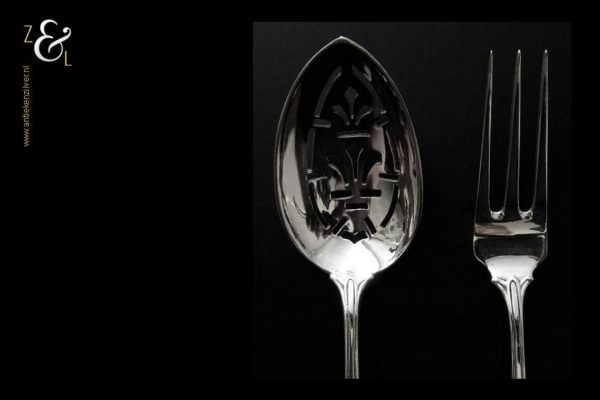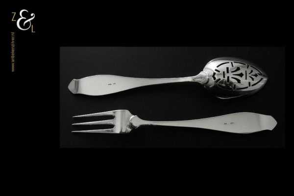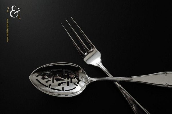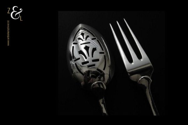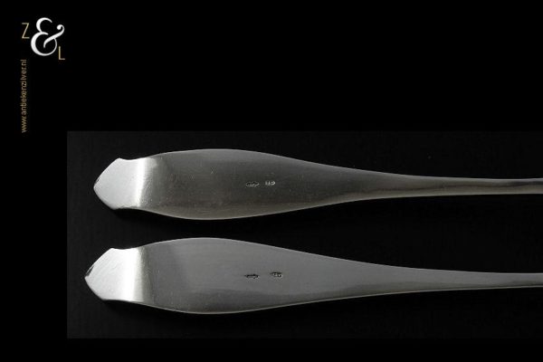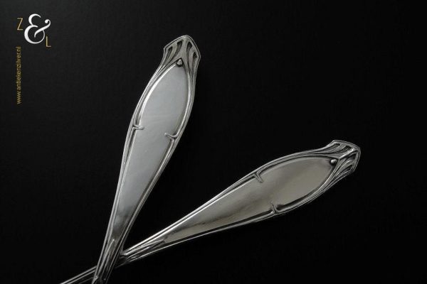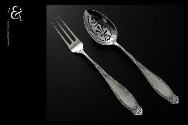 Olijfcouvert gemaakt in Utrecht bij de Koninklijke Utrechtse Fabriek van Zilverwerk C.J. Begeer (meesterteken CB ster in rechthoek) tussen 1906 en 1920. Dit in Art Nouveau uitgevoerde zilveren couvert met mooie gestileerde stelen en uitgezaagde lepelbak is 14.5 cm lang en weegt 47 gram.