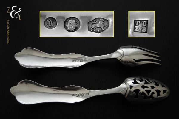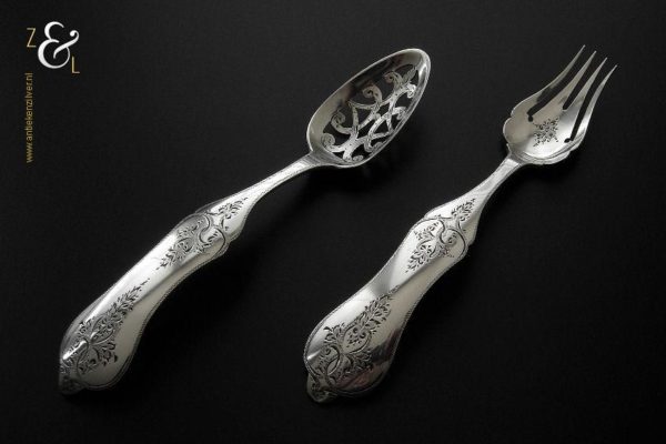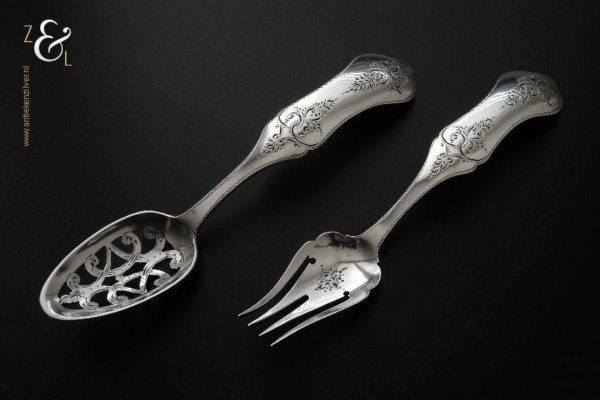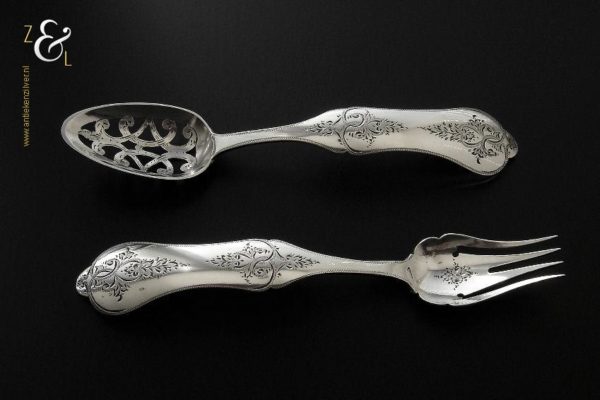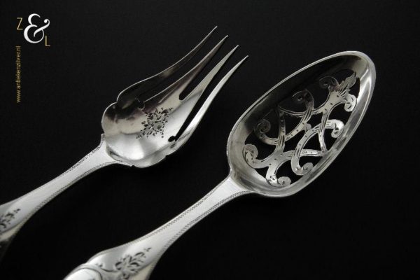 Dit olijfcouvert is gemaakt in Amsterdam door Theodorus Lambertus & Pierre Louis Uriot (Firma T.L. Uriot & Zoon) (meesterteken TU boven Z3 in vierkant) in het jaar 1879 (jaarletter U). Het zilveren Biedermeier olijfcouvert waarvan de stelen gegraveerd zijn met bloemmotieven en waarvan de bak gezaagd is met c-vormige voluten weegt 39 gram en is 14.7 cm lang.