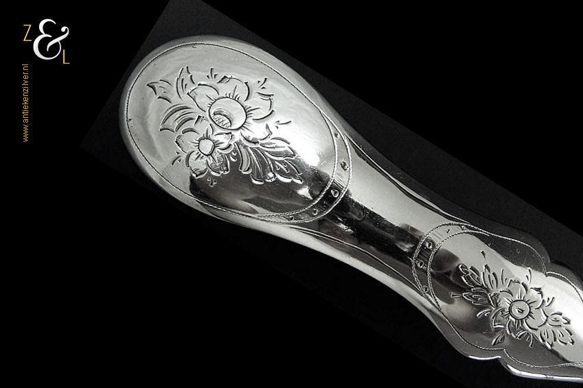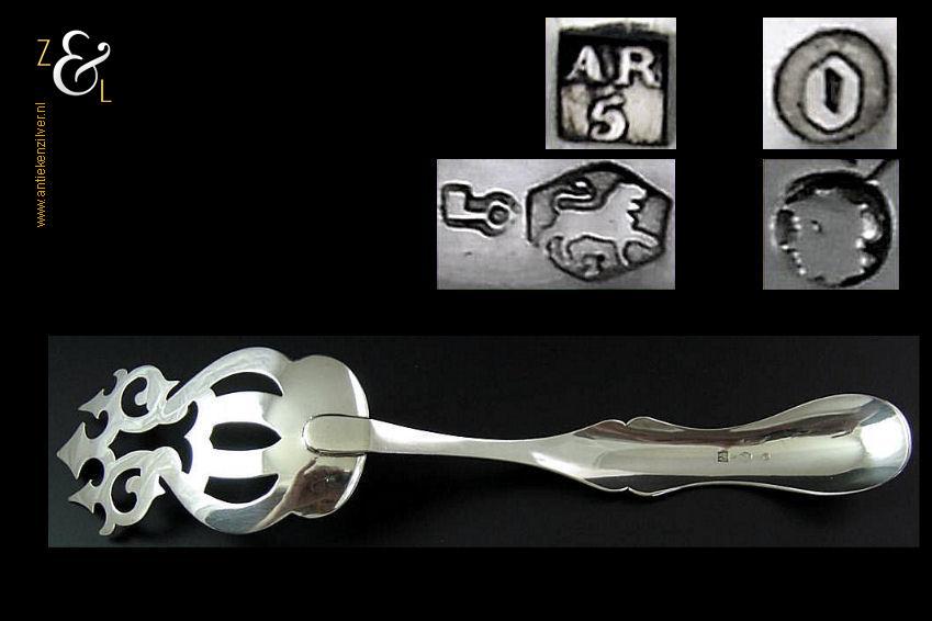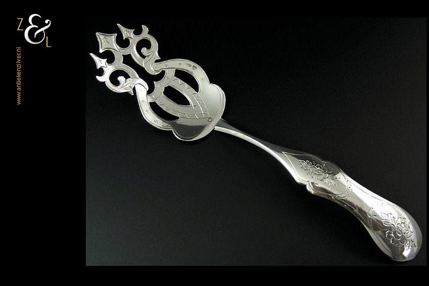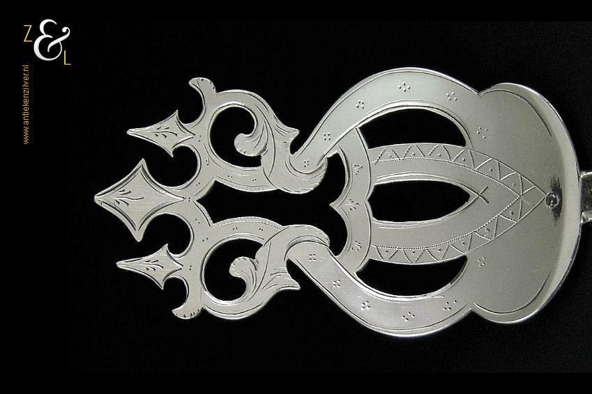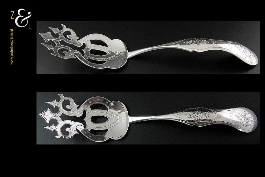 Sladienvork gemaakt in Den Bosch / ‘s-Hertogenbosch door Augustinus de Rooij (meesterteken AR boven 5 in vierkant) in het jaar 1873 (jaarletter O). De zilveren Neostijl sladienvork (die men ook als taartschep of petitfourschep kan gebruiken) heeft een in een aparte vorm uitgezaagd schepgedeelte en is geheel gegraveerd waarvan het handvat met bloemmotieven. De sladienvork weegt 63 gram en is 24.7 cm lang.