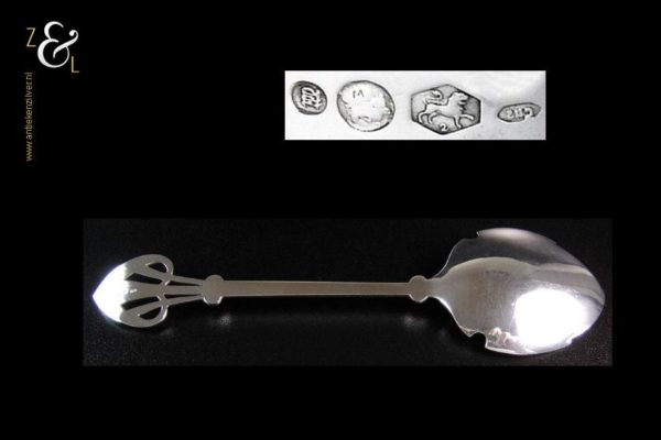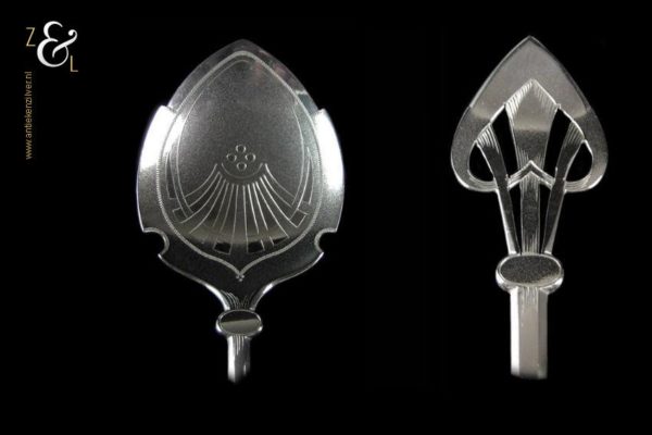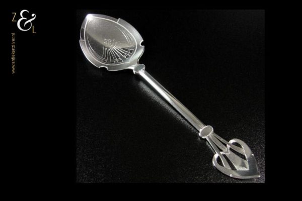 Bonbonlepel gemaakt in Schoonhoven door de Firma Pieter Greup & Zoon (meesterteken G 112 in zeshoek) in het jaar 1906 (jaarletter W). Deze zilveren deels gematteerde (matteren is een bewerking waarbij de zilversmid het oppervlak van een zilveren voorwerp een matte structuur geeft) Art Deco lepel weegt 33 gram en is 17.8 cm lang.